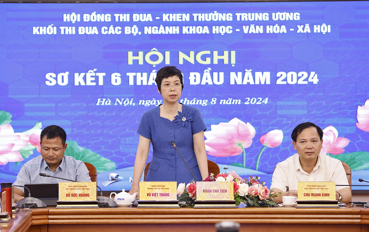| Tổng giám đốc TTXVN Vũ Việt Trang phát biểu tại hội nghị sơ kết công tác 6 tháng đầu năm 2024 của Khối thi đua các bộ, ngành Khoa học - Văn hóa - Xã hội, ngày 15/8 |