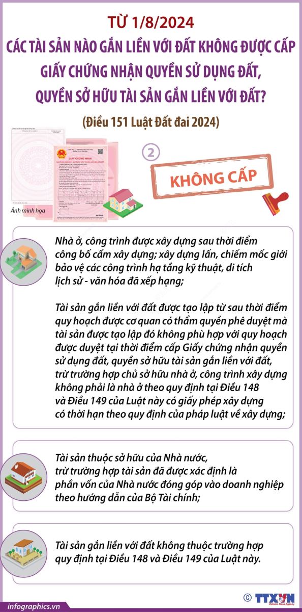 Phổ biến giáo dục Pháp luậtThông tin đồ họa Từ 1/8/2024: Các tài sản nào gắn liền với đất không được cấp Giấy chứng nhận quyền sử dụng đất, quyền sở hữu tài sản gắn liền với đất? (Phần 2) Thứ năm, 15/08/2024 16:00 Theo Điều 151 Luật Đất đai 2024, từ 1/8/2024, các tài sản gắn liền với đất không được cấp Giấy chứng nhận quyền sử dụng đất, quyền sở hữu tài sản gắn liền với đất trong trường hợp sau đây: