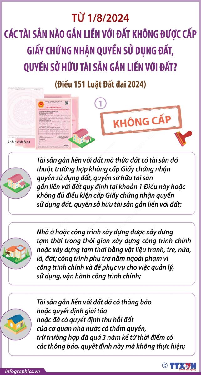 Theo Điều 151 Luật Đất đai 2024, từ 1/8/2024, các tài sản gắn liền với đất không được cấp Giấy chứng nhận quyền sử dụng đất, quyền sở hữu tài sản gắn liền với đất trong trường hợp sau đây: