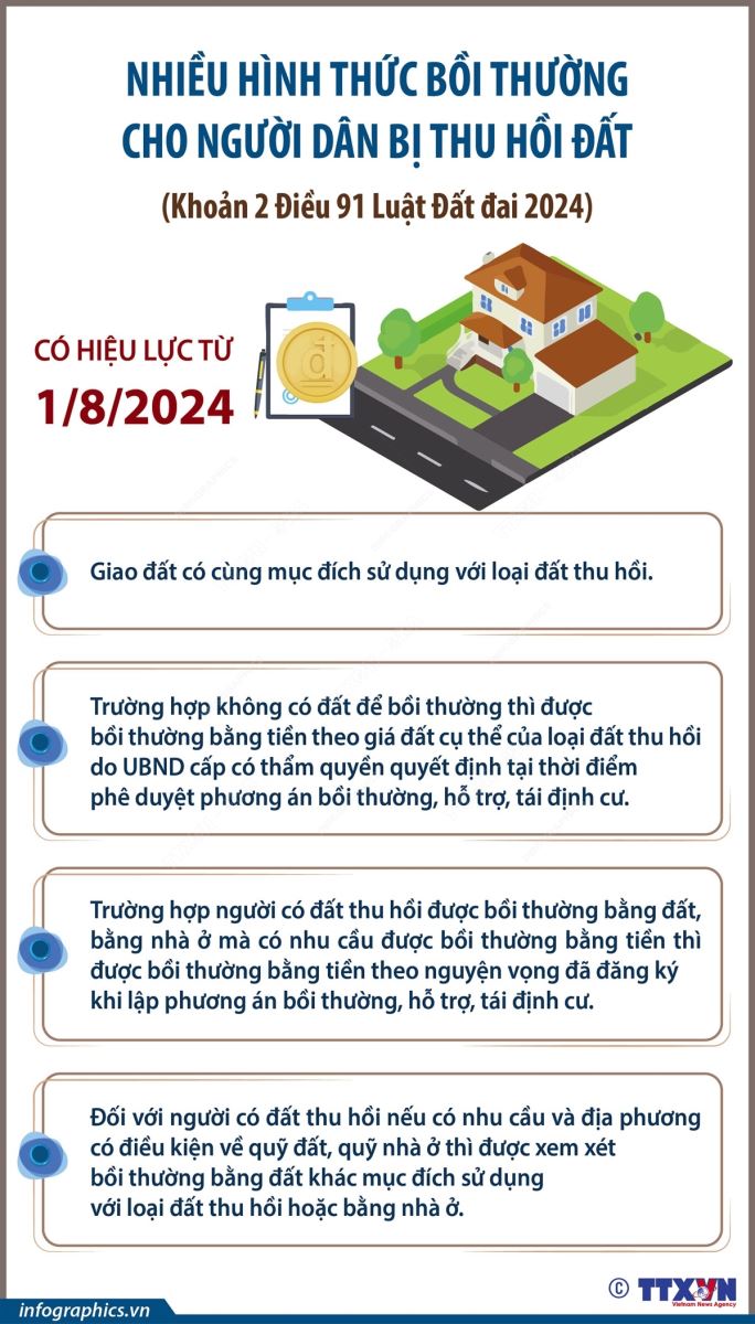 Phổ biến giáo dục Pháp luậtThông tin đồ họa Nhiều hình thức bồi thường cho người dân bị thu hồi đất từ 1/8/2024 Thứ năm, 15/08/2024 16:04 Khoản 2 Điều 91 Luật Đất đai 2024, có hiệu lực từ 1/8/2024 quy định, việc bồi thường về đất được thực hiện bằng việc giao đất có cùng mục đích sử dụng với loại đất thu hồi, trường hợp không có đất để bồi thường thì được bồi thường bằng tiền theo giá đất cụ thể của loại đất thu hồi do UBND cấp có thẩm quyền quyết định tại thời điểm phê duyệt phương án bồi thường, hỗ trợ, tái định cư. Trường hợp người có đất thu hồi được bồi thường bằng đất, bằng nhà ở mà có nhu cầu được bồi thường bằng tiền thì được bồi thường bằng tiền theo nguyện vọng đã đăng ký khi lập phương án bồi thường, hỗ trợ, tái định cư. Đối với người có đất thu hồi nếu có nhu cầu và địa phương có điều kiện về quỹ đất, quỹ nhà ở thì được xem xét bồi thường bằng đất khác mục đích sử dụng với loại đất thu hồi hoặc bằng nhà ở.