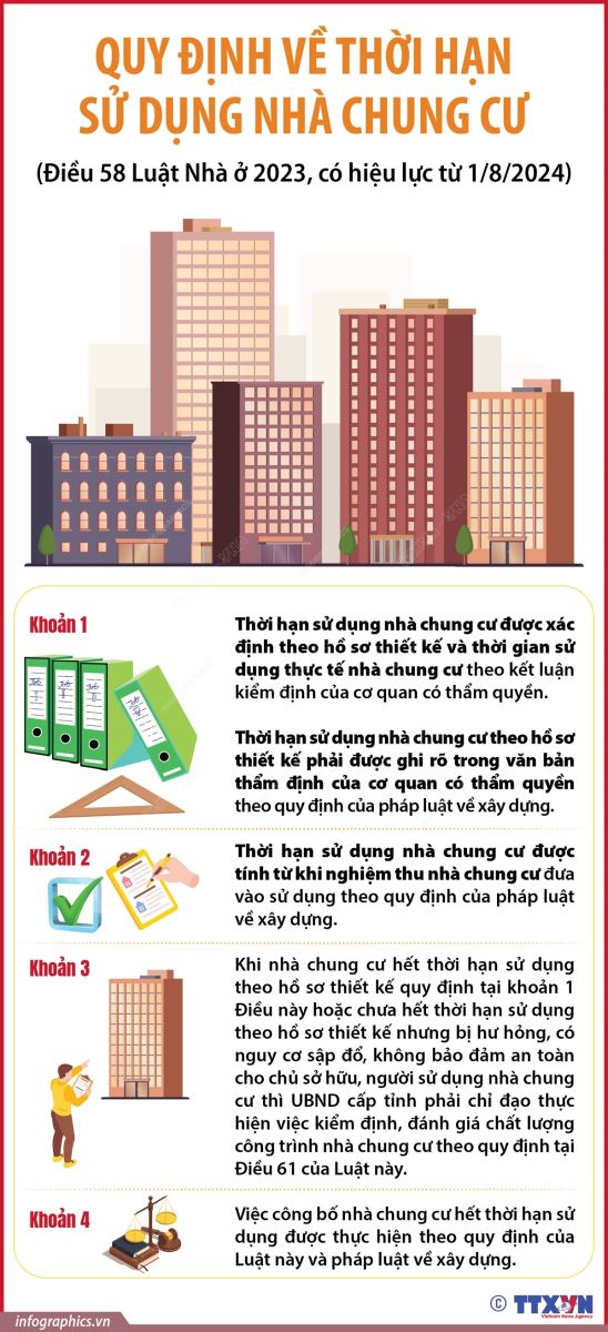 Phổ biến giáo dục Pháp luậtThông tin đồ họa Quy định về thời hạn sử dụng nhà chung cư từ 1/8/2024 Thứ năm, 15/08/2024 16:05 Theo Điều 58 Luật Nhà ở 2023, từ 1/8/2024, thời hạn sử dụng nhà chung cư được xác định theo hồ sơ thiết kế và thời gian sử dụng thực tế nhà chung cư theo kết luận kiểm định của cơ quan có thẩm quyền. Thời hạn sử dụng nhà chung cư theo hồ sơ thiết kế phải được ghi rõ trong văn bản thẩm định của cơ quan có thẩm quyền theo quy định của pháp luật về xây dựng.