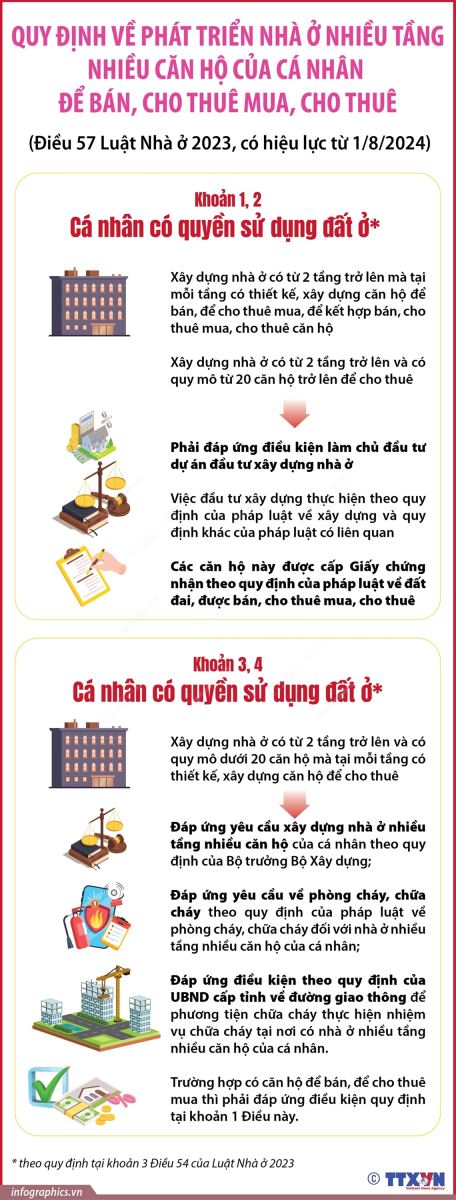Phổ biến giáo dục Pháp luậtThông tin đồ họa Quy định về phát triển nhà ở nhiều tầng nhiều căn hộ của cá nhân để bán, cho thuê mua, cho thuê từ 1/8/2024 Thứ năm, 15/08/2024 16:07 Theo Điều 57 Luật Nhà ở 2023, từ 1/8/2024, cá nhân có quyền sử dụng đất ở theo quy định tại khoản 3 Điều 54 của Luật này xây dựng nhà ở có từ 2 tầng trở lên mà tại mỗi tầng có thiết kế, xây dựng căn hộ để bán, để cho thuê mua, để kết hợp bán, cho thuê mua, cho thuê căn hộ; Nhà ở có từ 2 tầng trở lên và có quy mô từ 20 căn hộ trở lên để cho thuê thì phải đáp ứng điều kiện làm chủ đầu tư dự án đầu tư xây dựng nhà ở. Việc đầu tư xây dựng thực hiện theo quy định của pháp luật về xây dựng và quy định khác của pháp luật có liên quan đối với dự án đầu tư xây dựng nhà ở. Các căn hộ này được cấp Giấy chứng nhận theo quy định của pháp luật về đất đai, được bán, cho thuê mua, cho thuê theo quy định của Luật này, pháp luật về kinh doanh bất động sản.