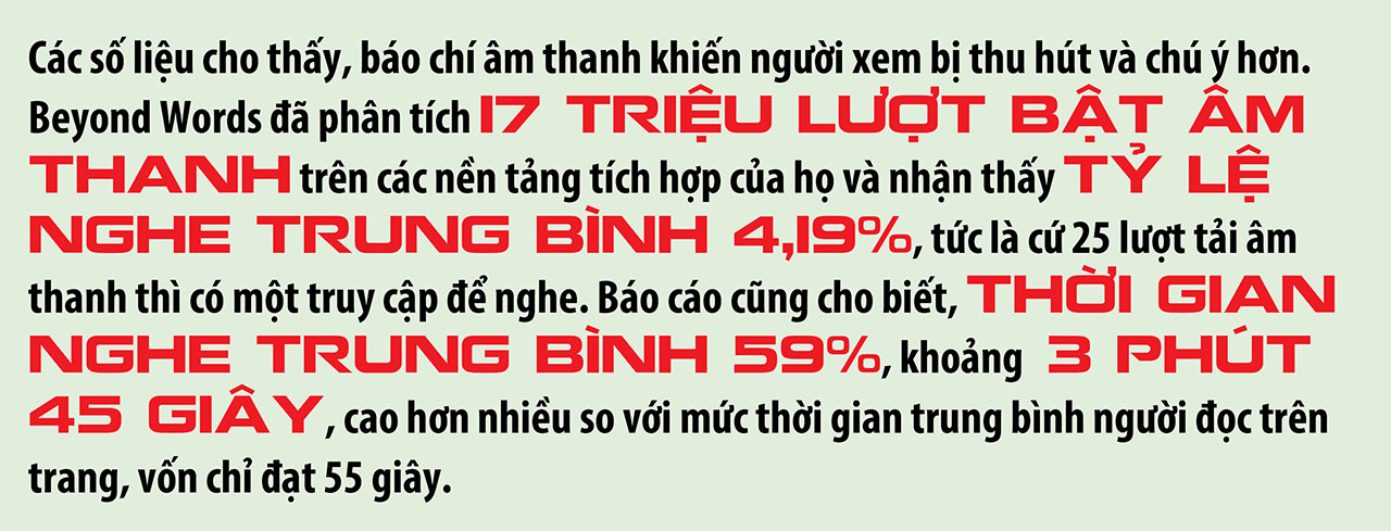 Sáng tạo báo chí không nhất thiết giới hạn trong văn bản. Âm thanh cũng đang là mô hình được ưa thích, đáng tin cậy khi truyền tải thông tin. Theo Viện nghiên cứu báo chí Reuters, 72% cơ quan báo chí đầu tư vào âm thanh trong năm 2023 như là cách mới để thu hút người đăng ký dài hạn và người dùng mới. Thông tin này cũng phù hợp với dữ liệu trong Báo cáo tương tác âm thanh của Beyond Words: 46% người Mỹ nghe nội dung âm thanh hằng ngày vào năm 2022, với tỷ lệ âm thanh đọc nội dung là 51%. Vì thế, các cơ quan báo chí có xu hướng tập trung vào mảng âm thanh bởi nhu cầu nội dung báo chí âm thanh của công chúng đang tăng cao.