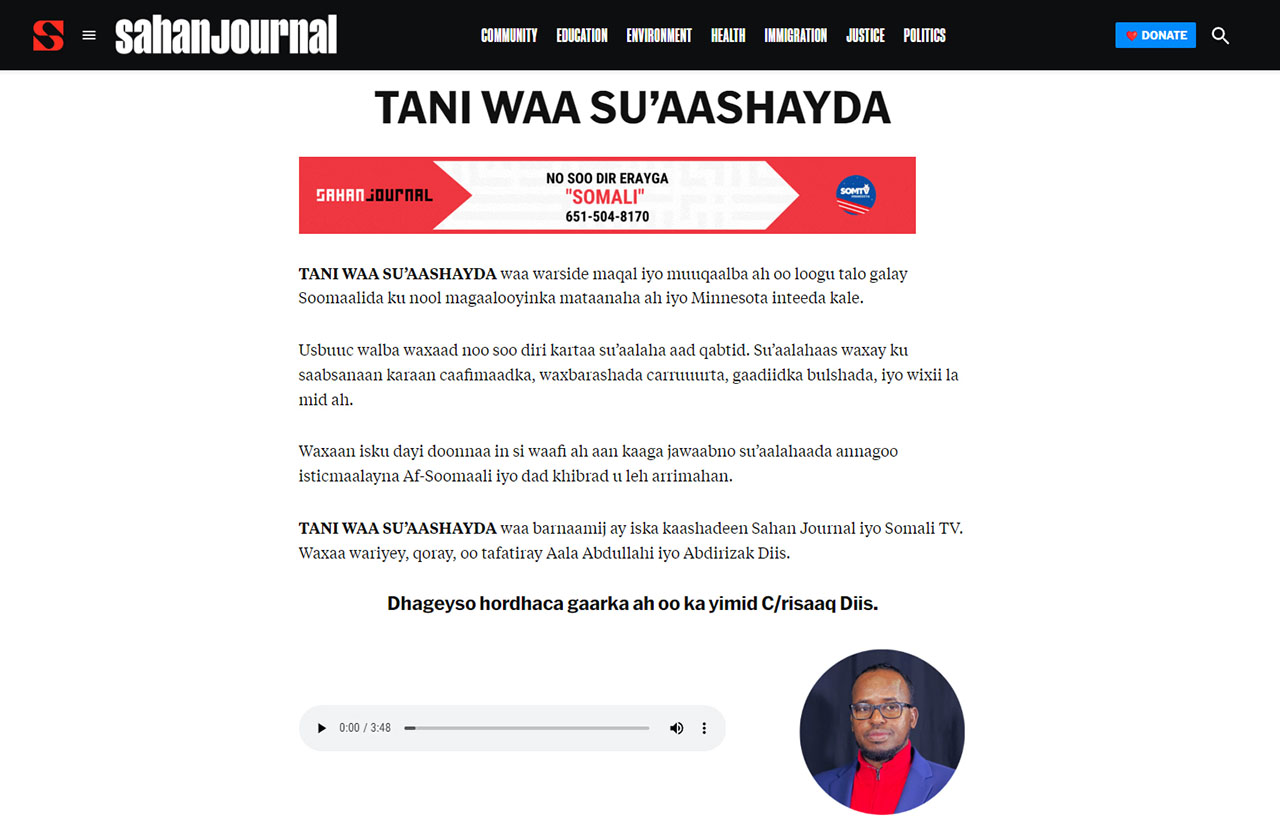 “Tani waa su’aashayda” có nghĩa là “Đây là câu hỏi của tôi” trong tiếng Somali, được phát triển sau nhiều năm lắng nghe các nội dung tin tức của Google và sự phối hợp chặt chẽ với các tổ chức truyền thông phục vụ đối tượng người nói tiếng Somali. Những nội dung âm thanh này dành cho các cộng đồng nói tiếng Anh, gồm người nhập cư, tị nạn và cộng đồng không nói tiếng Anh khác ở Minnesota. “Tani waa su’aashayda” đem đến cách mới thay thế định dạng Newsletter truyền thống mà không có văn bản, chữ viết. Những câu hỏi mà người Somalia đưa ra và phản hồi của họ sau các chương trình là trọng tâm hoạt động của Công ty này. Chương trình do các biên tập viên Aala Abdullahi và Diis của Somali TV đồng sản xuất, dùng nền tảng Groundsource để gửi các file âm thanh dưới định dạng MP3 tới người đăng ký thông qua tin nhắn SMS. Định dạng này giúp giao tiếp trực tiếp và gần gũi với khán giả mà không phụ thuộc vào truyền thông xã hội và có thể đưa thông tin về những vấn đề mà cộng đồng quan tâm.