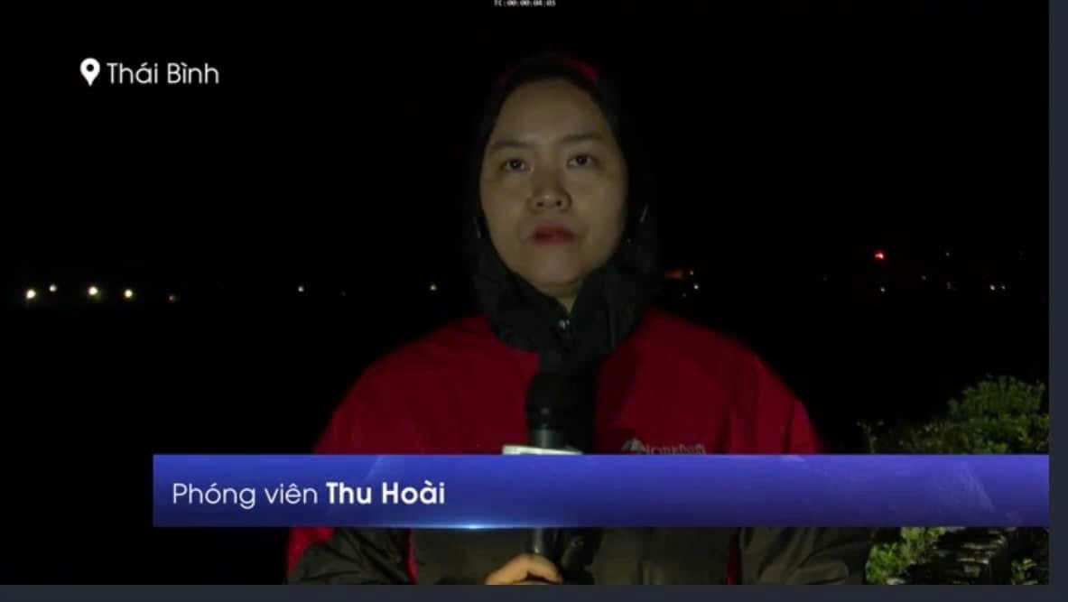 Phóng viên CQTT TTXVN tại Thái Bình Đinh Thị Thu Hoài thông tin về cơn bão số 3, ngày 7/9