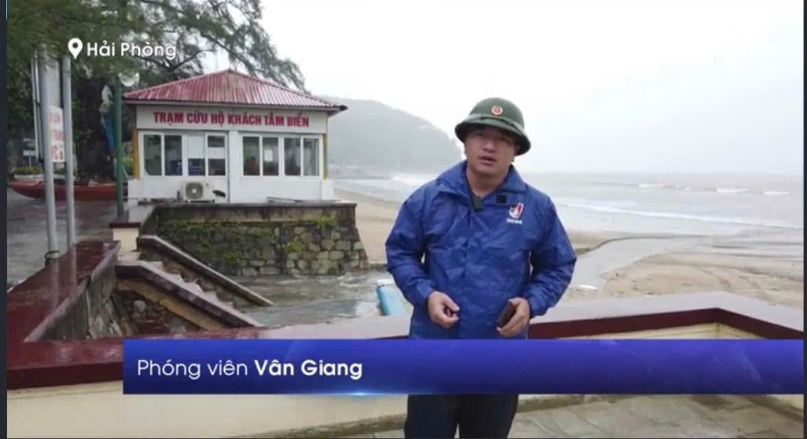 Phóng viên Truyền hình Thông tấn Vân Giang đưa tin về cơn bão số 3 tại Hải Phòng, ngày 7/9