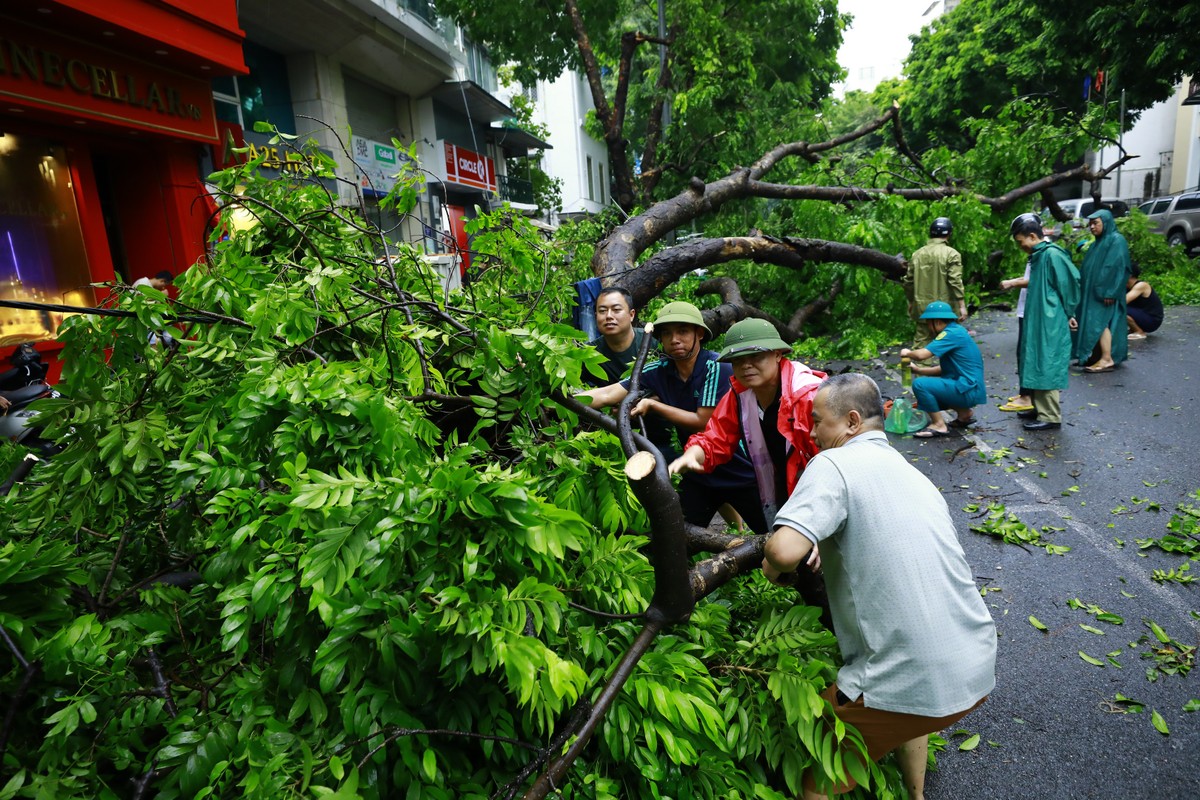 Bộ đội tham gia cắt cây đổ, khắc phục hậu quả cơn bão số 3 trên phố Tăng Bạt Hổ, Hà Nội