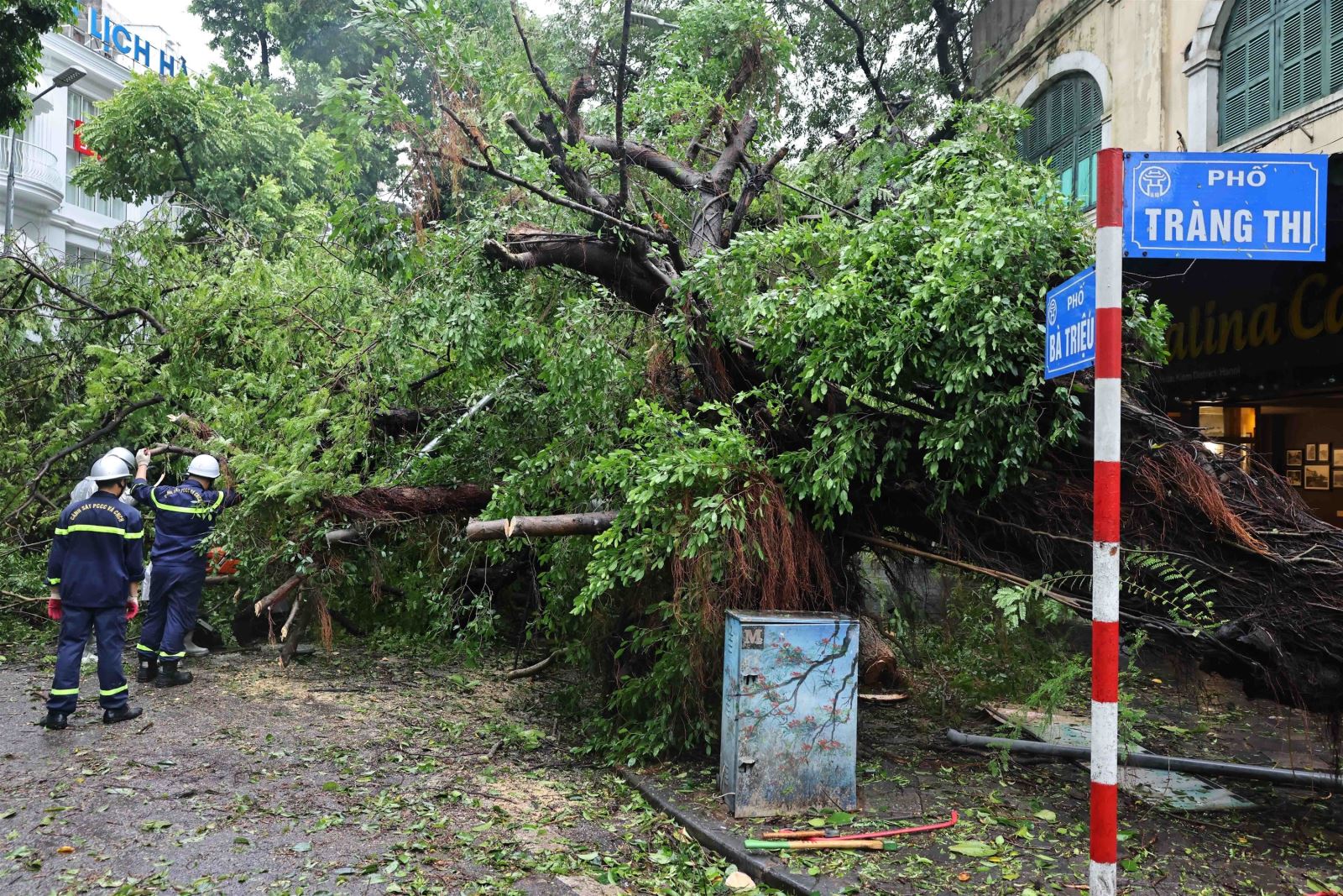 Lực lượng chức năng khắc phục hậu quả tại phố Bà Triệu, Hà Nội