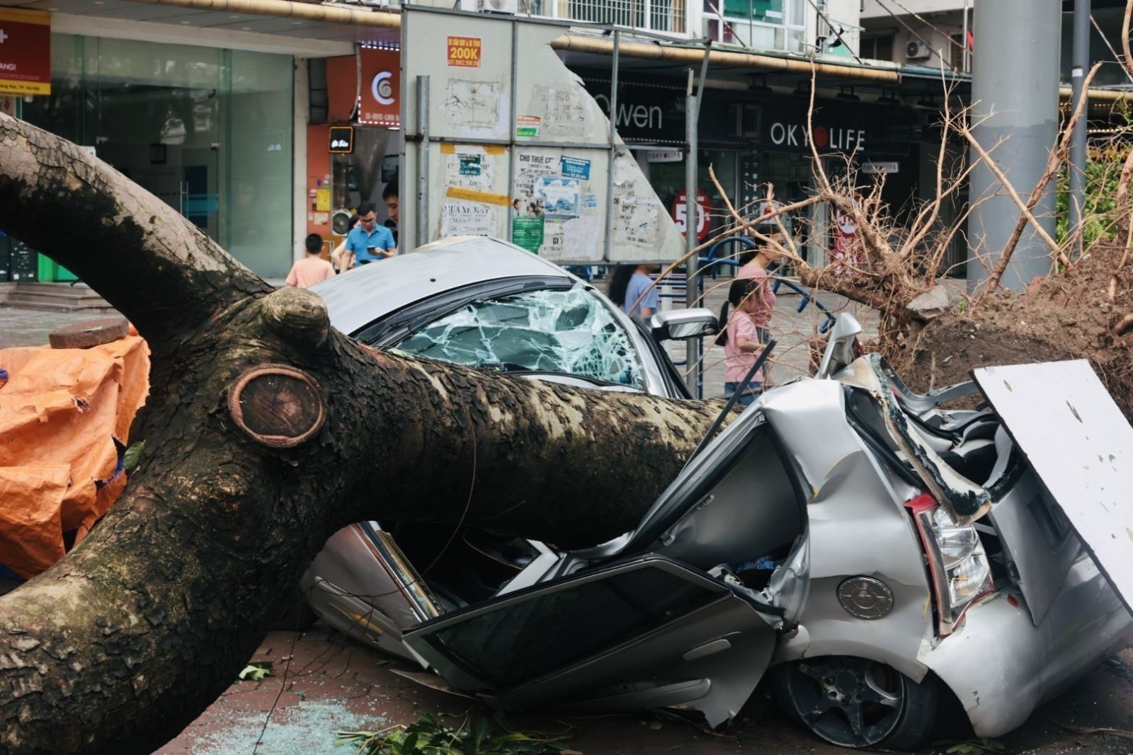 Cây đổ đè nát ô tô tại chung cư HH Linh Đàm, Hà Nội