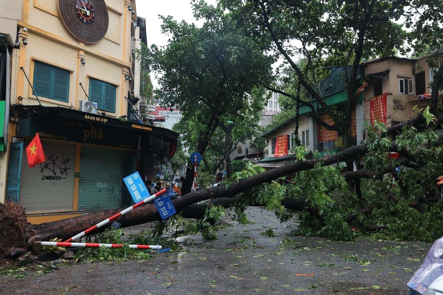 Cây đổ chắn ngang đường đoạn ngã tư Đinh Tiên Hoàng - Lò Sũ, quận Hoàn Kiếm, Hà Nội