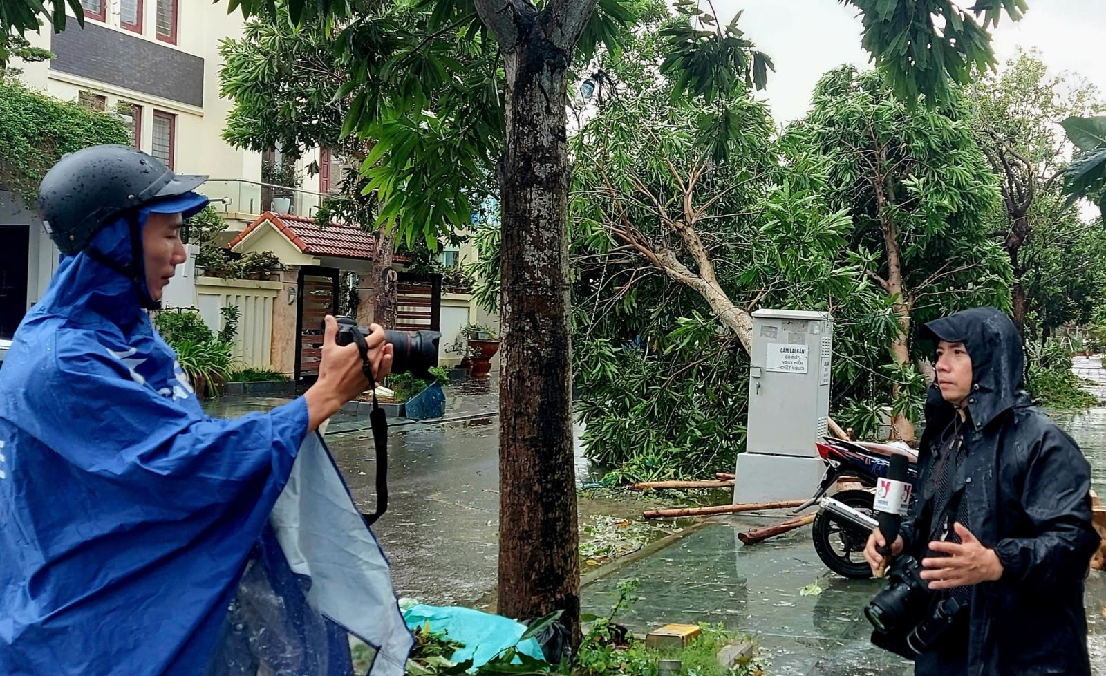 | Nhóm phóng viên CQTT TTXVN tại Quảng Ninh tác nghiệp trong cơn bão số 3 tại phường Hồng Hà, TP. Hạ Long, ngày 8/9 |