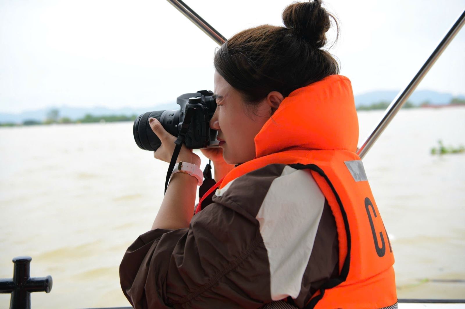 | Phóng viên CQTT TTXVN tại Ninh Bình Hải Yến tác nghiệp tại vùng ngập lụt xã Gia Lạc, huyện Gia Viễn, tỉnh Ninh Bình, ngày 12/9 |