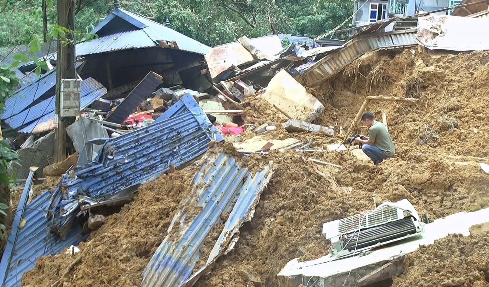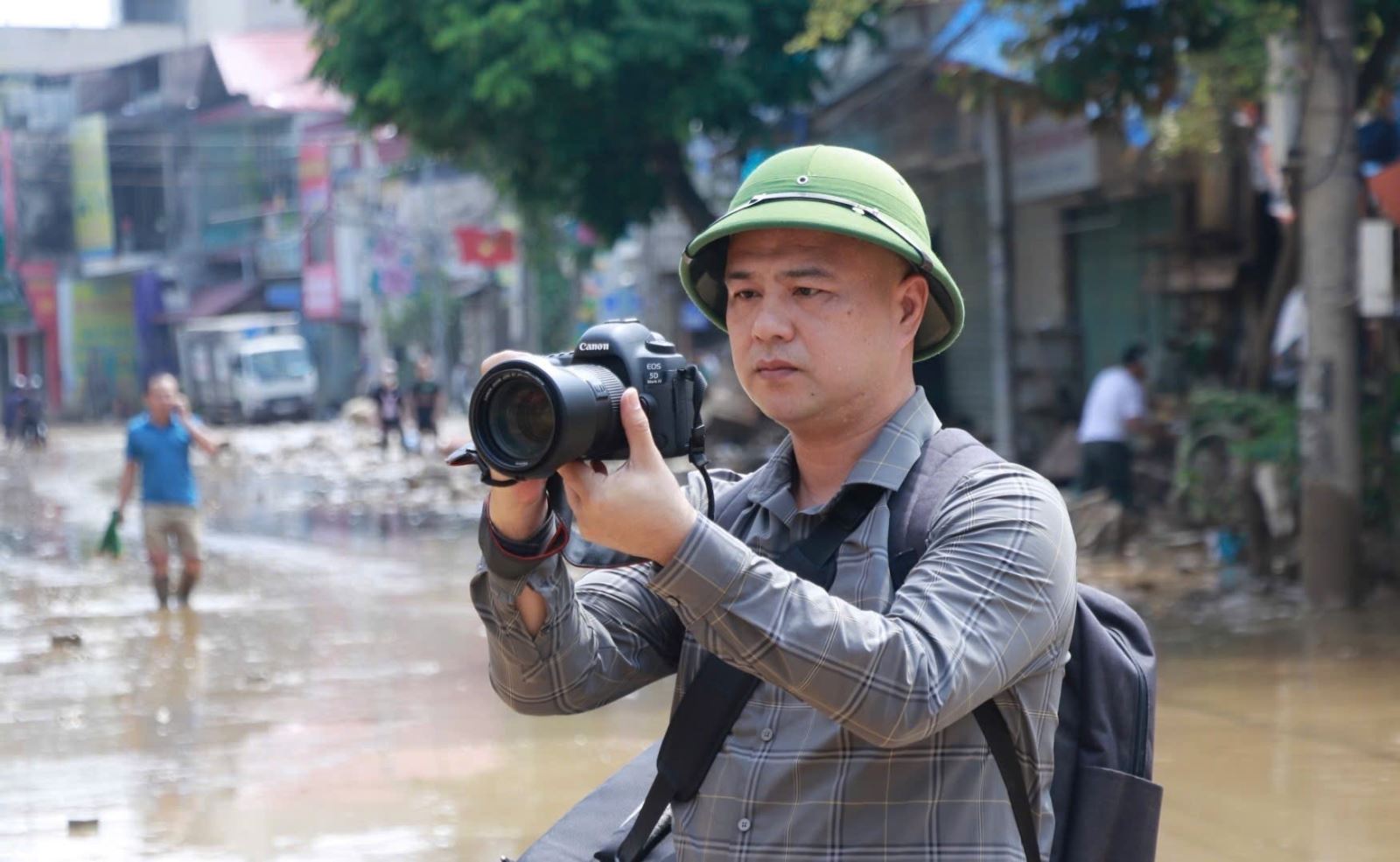 | Trưởng CQTT TTXVN tại Lào Cai Phạm Hồng Ninh tác nghiệp tại khu vực xảy ra trận lũ quét hoàng - làng Nủ, xã Phúc Khánh, huyện Bảo Yên, tỉnh Lào Cai, ngày 11/9 |