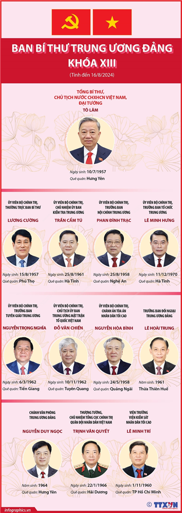 Tin cùng chuyên mục Từ 1/9 đến 30/11/2024: Giảm 50% lệ phí trước bạ lần đầu đối với ô tô sản xuất, lắp ráp trong nước17/09/2024 15:22Theo Nghị định số 109/2024/NĐ-CP ngày 29/8/2024 của Chính phủ, từ 1/9 đến 30/11/2024, mức thu lệ phí trước bạ đối với ô tô, rơ moóc hoặc sơ mi rơ moóc được kéo bởi ô tô và các loại xe tương tự xe ô tô được sản xuất, lắp ráp trong nước bằng 50% mức... 12 nhiệm vụ, giải pháp trọng tâm của ngành giáo dục năm học 2024-202517/09/2024 15:21Nhằm thực hiện hiệu quả các quan điểm, chỉ đạo của Đảng, Chính phủ về đổi mới căn bản, toàn diện giáo dục và đào tạo; quyết tâm thực hiện thắng lợi các mục tiêu, nhiệm vụ được giao tại Chương trình hành động của Chính phủ thực hiện Nghị quyết Đại hội đại biểu... Cập nhật thiệt hại do bão số 3 và mưa lũ (tính đến 17h ngày 16/9/2024)17/09/2024 15:05Theo báo cáo nhanh từ Cục Quản lý đê điều và Phòng, chống thiên tai (Bộ Nông nghiệp và Phát triển nông thôn), tính đến 17h ngày 16/9/2024, số người chết và mất tích do bão số 3, mưa lũ tại các tỉnh phía Bắc lên... Bão số 3: Xử lý nghiêm hành vi lừa đảo kêu gọi từ thiện và đưa thông tin sai lệch17/09/2024 15:04Thời gian gần đây, lợi dụng ảnh hưởng của bão số 3, trên không gian mạng xuất hiện tình trạng lừa đảo kêu gọi từ thiện để trục lợi và đưa thông tin sai lệch về bão số 3. Các địa phương đã xử lý các đối tượng; khuyến cáo người dân tỉnh táo... Các đồng chí Ủy viên Bộ Chính trị khóa XIII (tính đến 16/8/2024)21/08/2024 08:29Ngày 16/8/2024, tại Thủ đô Hà Nội, Ban Chấp hành Trung ương Đảng khóa XIII bầu bổ sung đồng chí Thượng tướng Lương Tam Quang, Ủy viên Trung ương Đảng, Bí thư Đảng ủy Công an Trung ương, Bộ trưởng Bộ Công an làm Ủy viên Bộ Chính trị. Như vậy, tính đến... Các đồng chí trong Ban Bí thư Trung ương Đảng khóa XIII (tính đến 16/8/2024)21/08/2024 08:28Ngày 16/8/2024, tại Thủ đô Hà Nội, Ban Chấp hành Trung ương Đảng khóa XIII bầu bổ sung Ủy viên Ban Bí thư 3 đồng chí gồm: Đồng chí Nguyễn Duy Ngọc, Ủy viên Trung ương Đảng, Chánh Văn phòng Trung ương Đảng; đồng chí Thượng tướng Trịnh Văn Quyết, Ủy viên...