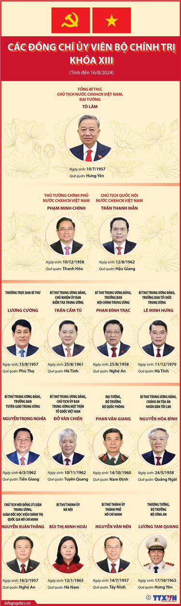 Tin cùng chuyên mục 79 năm Thông tấn xã Việt Nam: Những mốc son tự hào17/09/2024 15:24Ngày 15/9/1945, bản Tuyên ngôn Độc lập khai sinh ra nước Việt Nam Dân chủ cộng hòa (nay là CHXHCN Việt Nam) được phát đi toàn thế giới bằng 3 thứ tiếng Việt, Pháp, Anh - đánh dấu sự ra đời của Việt Nam Thông tấn xã (nay là Thông tấn xã Việt Nam),... Từ 1/9 đến 30/11/2024: Giảm 50% lệ phí trước bạ lần đầu đối với ô tô sản xuất, lắp ráp trong nước17/09/2024 15:22Theo Nghị định số 109/2024/NĐ-CP ngày 29/8/2024 của Chính phủ, từ 1/9 đến 30/11/2024, mức thu lệ phí trước bạ đối với ô tô, rơ moóc hoặc sơ mi rơ moóc được kéo bởi ô tô và các loại xe tương tự xe ô tô được sản xuất, lắp ráp trong nước bằng 50% mức... 12 nhiệm vụ, giải pháp trọng tâm của ngành giáo dục năm học 2024-202517/09/2024 15:21Nhằm thực hiện hiệu quả các quan điểm, chỉ đạo của Đảng, Chính phủ về đổi mới căn bản, toàn diện giáo dục và đào tạo; quyết tâm thực hiện thắng lợi các mục tiêu, nhiệm vụ được giao tại Chương trình hành động của Chính phủ thực hiện Nghị quyết Đại hội đại biểu... Cập nhật thiệt hại do bão số 3 và mưa lũ (tính đến 17h ngày 16/9/2024)17/09/2024 15:05Theo báo cáo nhanh từ Cục Quản lý đê điều và Phòng, chống thiên tai (Bộ Nông nghiệp và Phát triển nông thôn), tính đến 17h ngày 16/9/2024, số người chết và mất tích do bão số 3, mưa lũ tại các tỉnh phía Bắc lên... Bão số 3: Xử lý nghiêm hành vi lừa đảo kêu gọi từ thiện và đưa thông tin sai lệch17/09/2024 15:04Thời gian gần đây, lợi dụng ảnh hưởng của bão số 3, trên không gian mạng xuất hiện tình trạng lừa đảo kêu gọi từ thiện để trục lợi và đưa thông tin sai lệch về bão số 3. Các địa phương đã xử lý các đối tượng; khuyến cáo người dân tỉnh táo... Các đồng chí Ủy viên Bộ Chính trị khóa XIII (tính đến 16/8/2024)21/08/2024 08:29Ngày 16/8/2024, tại Thủ đô Hà Nội, Ban Chấp hành Trung ương Đảng khóa XIII bầu bổ sung đồng chí Thượng tướng Lương Tam Quang, Ủy viên Trung ương Đảng, Bí thư Đảng ủy Công an Trung ương, Bộ trưởng Bộ Công an làm Ủy viên Bộ Chính trị. Như vậy, tính đến...
