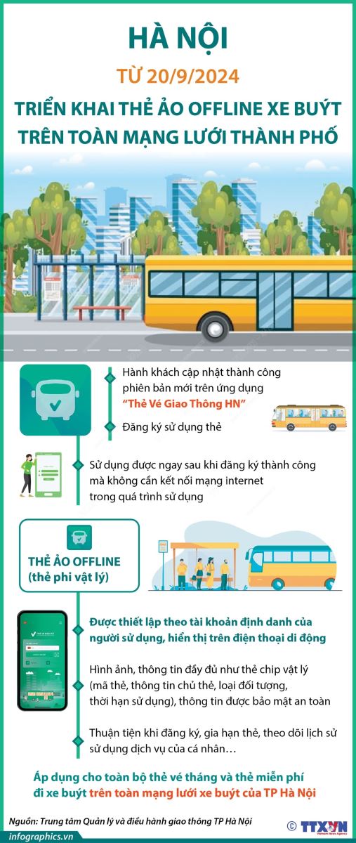 Phổ biến giáo dục Pháp luậtThông tin đồ họa Từ 20/9/2024: Hà Nội triển khai thẻ ảo offline cho hành khách tham gia vận tải công cộng Thứ hai, 23/09/2024 14:07 Từ 20/9/2024, Trung tâm Quản lý và điều hành giao thông thành phố Hà Nội triển khai thẻ vé tháng ảo offline (thẻ phi vật lý) cho hệ thống vận tải hành khách công cộng trên địa bàn Thủ đô. Loại hình thẻ vé ảo áp dụng cho toàn bộ thẻ vé tháng và thẻ miễn phí đi xe buýt trên toàn mạng lưới vận tải hành khách công cộng bằng xe buýt của thành phố Hà Nội. Đặc biệt, hành khách có thể sử dụng hình thức thẻ ảo offline tham gia giao thông công cộng kể cả khi không có mạng internet.