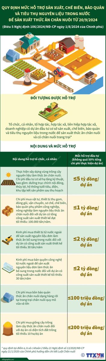 Theo Điều 5 Nghị định 106/2024/NĐ-CP ngày 1/8/2024 của Chính phủ, từ 20/9/2024, tổ chức, cá nhân, tổ hợp tác, hợp tác xã, liên hiệp hợp tác xã, doanh nghiệp có dự án đầu tư cơ sở sản xuất, chế biến, bảo quản và tiêu thụ nguyên liệu trong nước để sản xuất thức ăn chăn nuôi và có chăn nuôi trang trại quy định tại điểm a, b và c khoản 2 Điều 21 Nghị định số 13/2020/NĐ-CP ngày 21/1/2020 của Chính phủ hướng dẫn chi tiết Luật Chăn nuôi sẽ được hỗ trợ đầu tư. Mức hỗ trợ không quá 50% tổng chi phí thực hiện dự án.