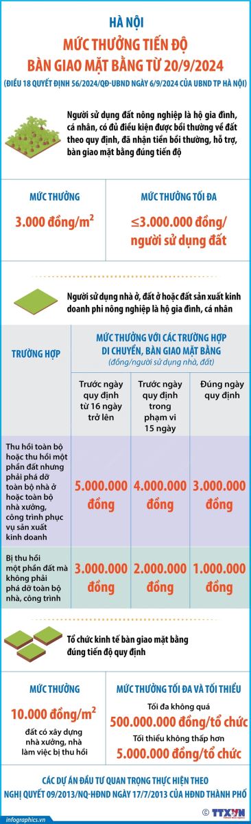 Phổ biến giáo dục Pháp luậtThông tin đồ họa Hà Nội: Mức thưởng tiến độ bàn giao mặt bằng từ 20/9/2024 Thứ ba, 24/09/2024 14:29 Theo Điều 18 Quyết định 56/2024/QĐ-UBND ngày 6/9/2024 của UBND TP Hà Nội, từ 20/9/2024, TP Hà Nội áp dụng cơ chế thưởng bằng tiền đối với trường hợp bàn giao mặt bằng đúng tiến độ (thực hiện khoản 7 Điều 111 Luật Đất đai).