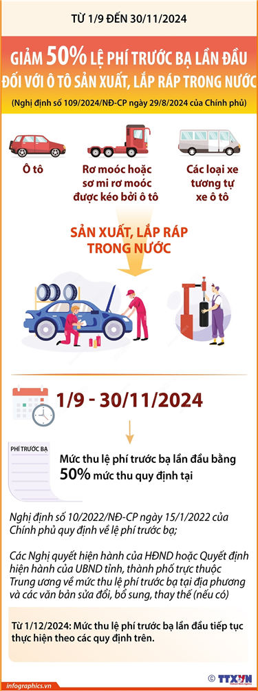 Tin cùng chuyên mục Hà Nội: Mức thưởng tiến độ bàn giao mặt bằng từ 20/9/202424/09/2024 14:29Theo Điều 18 Quyết định 56/2024/QĐ-UBND ngày 6/9/2024 của UBND TP Hà Nội, từ 20/9/2024, TP Hà Nội áp dụng cơ chế thưởng bằng tiền đối với trường hợp bàn giao mặt bằng đúng tiến độ (thực hiện khoản 7 Điều 111 Luật Đất đai). Thủ tướng yêu cầu hệ thống ngân hàng thực hiện “6 tăng”, “6 giảm”, “6 tăng tốc, bứt phá”24/09/2024 14:24Chiều 21/9/2024, kết luận Hội nghị Thường trực Chính phủ với các ngân hàng thương mại cổ phần về các giải pháp góp phần phát triển kinh tế - xã hội đất nước, Thủ tướng Chính phủ Phạm Minh Chính yêu cầu hệ thống ngân hàng thực hiện "6 tăng, 6 giảm, 6... Quy định mức hỗ trợ sản xuất, chế biến, bảo quản và tiêu thụ nguyên liệu trong nước để sản xuất thức ăn chăn nuôi từ 20/9/202423/09/2024 14:08Theo Điều 5 Nghị định 106/2024/NĐ-CP ngày 1/8/2024 của Chính phủ, từ 20/9/2024, tổ chức, cá nhân, tổ hợp tác, hợp tác xã, liên hiệp hợp tác xã, doanh nghiệp có dự án đầu tư cơ sở sản xuất, chế biến, bảo quản và tiêu thụ nguyên liệu trong nước để... Từ 20/9/2024: Hà Nội triển khai thẻ ảo offline cho hành khách tham gia vận tải công cộng23/09/2024 14:07Từ 20/9/2024, Trung tâm Quản lý và điều hành giao thông thành phố Hà Nội triển khai thẻ vé tháng ảo offline (thẻ phi vật lý) cho hệ thống vận tải hành khách công cộng trên địa bàn Thủ đô. Loại hình thẻ vé ảo áp dụng cho... 79 năm Thông tấn xã Việt Nam: Những mốc son tự hào17/09/2024 15:24Ngày 15/9/1945, bản Tuyên ngôn Độc lập khai sinh ra nước Việt Nam Dân chủ cộng hòa (nay là CHXHCN Việt Nam) được phát đi toàn thế giới bằng 3 thứ tiếng Việt, Pháp, Anh - đánh dấu sự ra đời của Việt Nam Thông tấn xã (nay là Thông tấn xã Việt Nam),... Từ 1/9 đến 30/11/2024: Giảm 50% lệ phí trước bạ lần đầu đối với ô tô sản xuất, lắp ráp trong nước17/09/2024 15:22Theo Nghị định số 109/2024/NĐ-CP ngày 29/8/2024 của Chính phủ, từ 1/9 đến 30/11/2024, mức thu lệ phí trước bạ đối với ô tô, rơ moóc hoặc sơ mi rơ moóc được kéo bởi ô tô và các loại xe tương tự xe ô tô được sản xuất, lắp ráp trong nước bằng 50% mức...