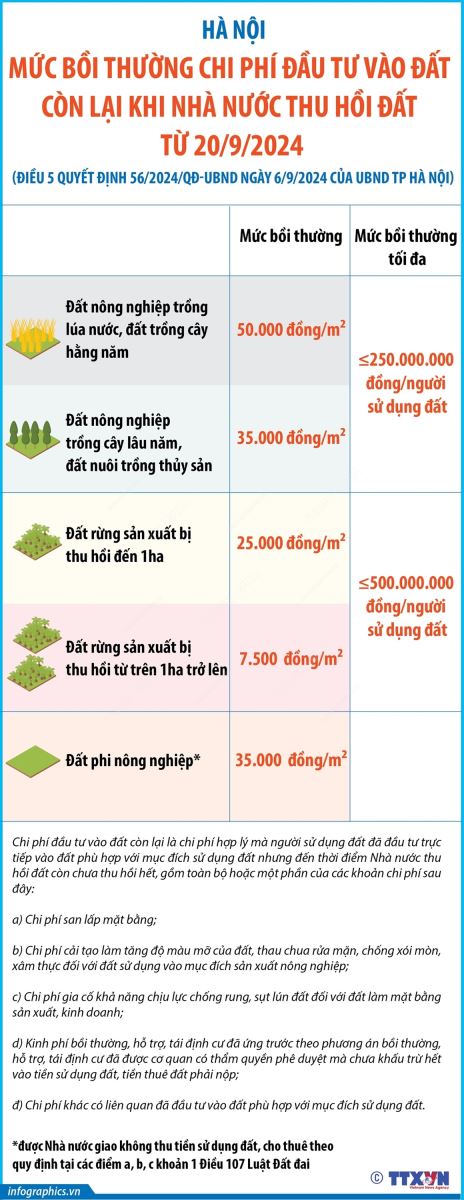 Phổ biến giáo dục Pháp luậtThông tin đồ họa Hà Nội: Mức bồi thường chi phí đầu tư vào đất còn lại khi Nhà nước thu hồi đất từ 20/9/2024 Thứ ba, 24/09/2024 14:31 Theo Điều 5 Quyết định 56/2024/QĐ-UBND ngày 6/9/2024 của UBND TP Hà Nội, từ 20/9/2024, người có đất thu hồi không có hồ sơ, chứng từ chứng minh đã đầu tư vào đất thì được bồi thường chi phí đầu tư vào đất còn lại theo mức sau: