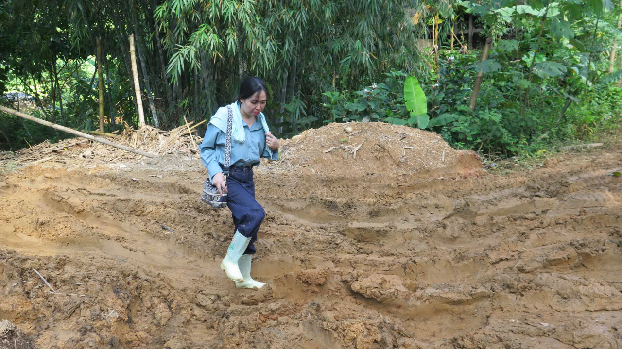 | Phóng viên CQTT TTXVN tại Lào Cai Lục Hương Thu trên đường vào vùng lũ thôn Làng Nủ, xã Phúc Khánh, huyện Bảo Yên, tỉnh Lào Cai, ngày 14/9 |