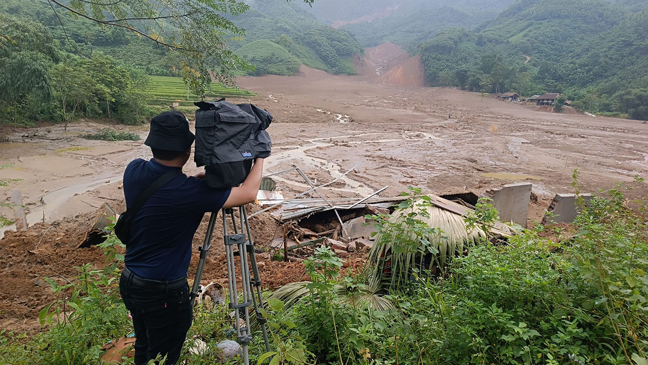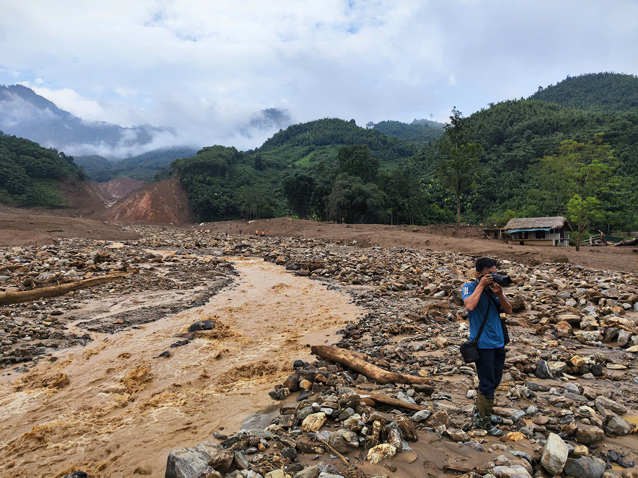 | Phóng viên Ban biên tập Ảnh Hoàng Trung Hiếu tác nghiệp tại hiện trường trận lũ quét kinh hoàng - thôn Làng Nủ, ngày 17/9 |