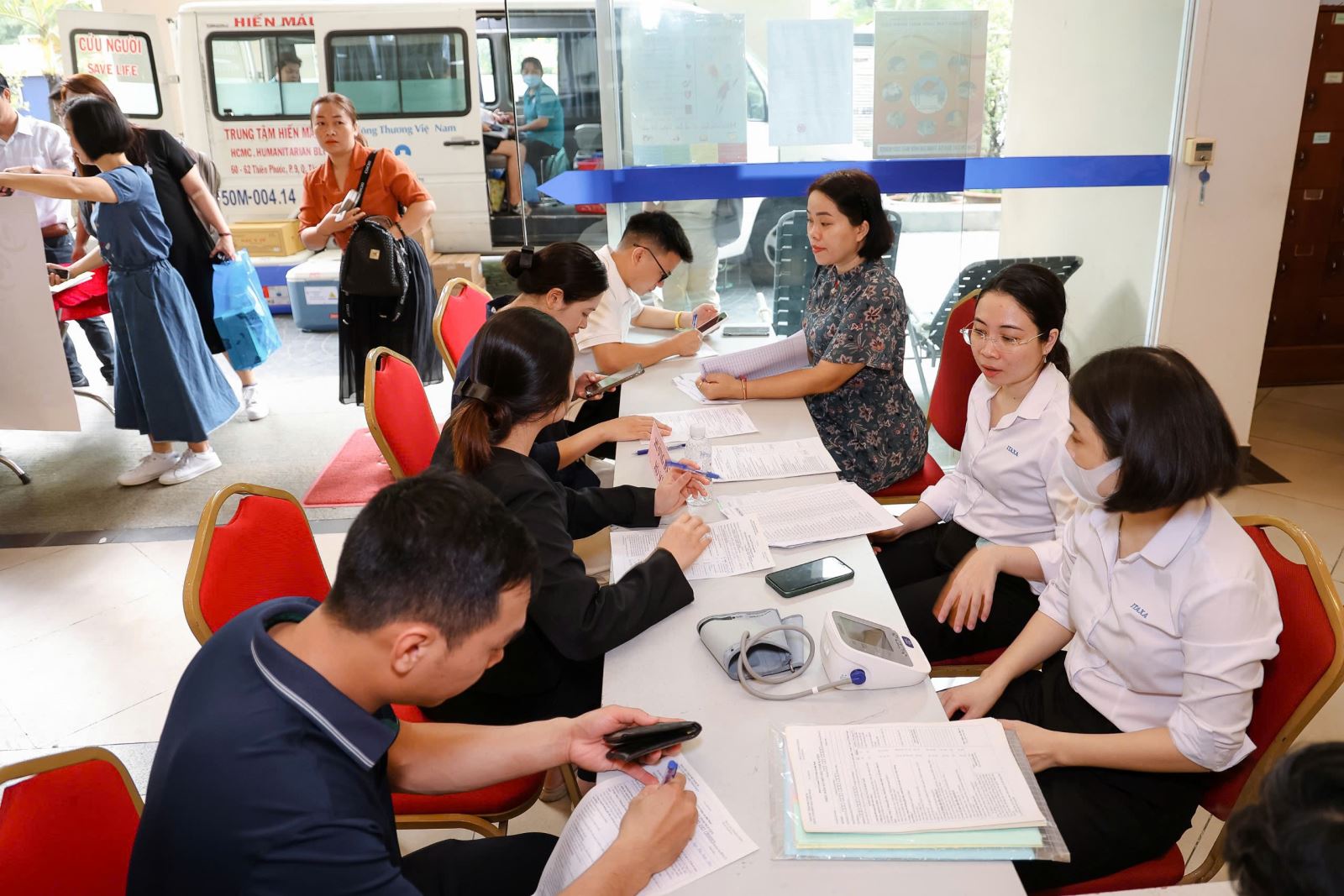 Sự kiện và kỷ niệmTin trong ngành Hiến máu vì cộng đồng Thứ ba, 08/10/2024 15:03 Ngày 8/10, Công đoàn Cơ quan Thông tấn xã Việt Nam (TTXVN) khu vực phía Nam phối hợp với Công đoàn Công ty TNHH MTV ITAXA tổ chức chương trình hiến máu nhân đạo với sự tham gia của 130 đoàn viên công đoàn. Đoàn viên Công đoàn Cơ quan TTXVN khu vực phía Nam và Công ty ITAXA tham gia hiến máu nhân đạo, ngày 8/10 Tại chương trình, Ban tổ chức đã tiếp nhận 119 đơn vị máu góp phần bổ sung nguồn máu dự trữ phục vụ công tác điều trị và phẫu thuật tại Trung tâm hiến máu nhân đạo TP. Hồ Chí Minh. Đây là hoạt động thường niên của Cơ quan khu vực phía Nam và Công ty ITAXA nhằm thể hiện trách nhiệm, nghĩa cử cao đẹp với cộng đồng, thiết thực giúp đỡ, kịp thời đáp ứng lượng máu cần thiết cho bệnh nhân./. Các công đoàn viên điền thông tin sức khỏe trước khi hiến máu, ngày 8/10 Nội san Thông tấn