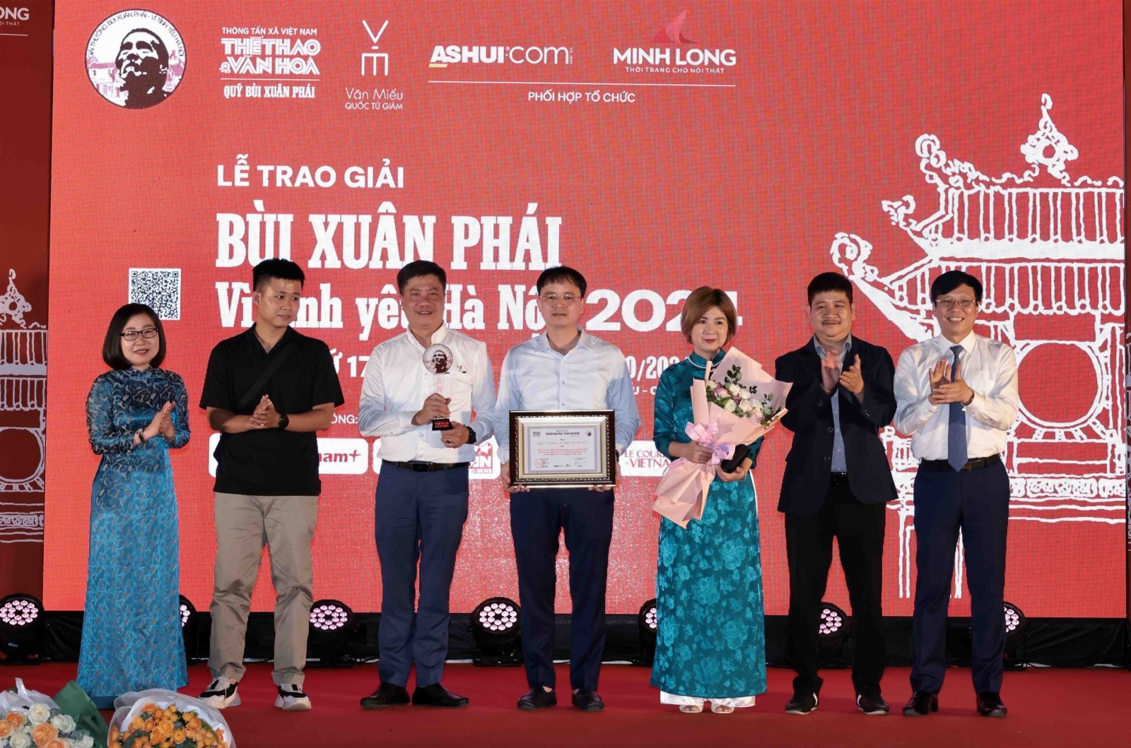 | Phó tổng giám đốc TTXVN Nguyễn Tuấn Hùng và Phó giáo sư, Tiến sĩ Bùi Hoài Sơn, Ủy viên Thường trực Ủy ban Văn hóa Giáo dục của Quốc hội trao giải Việc làm - Vì tình yêu Hà Nội, ngày 8/10 |