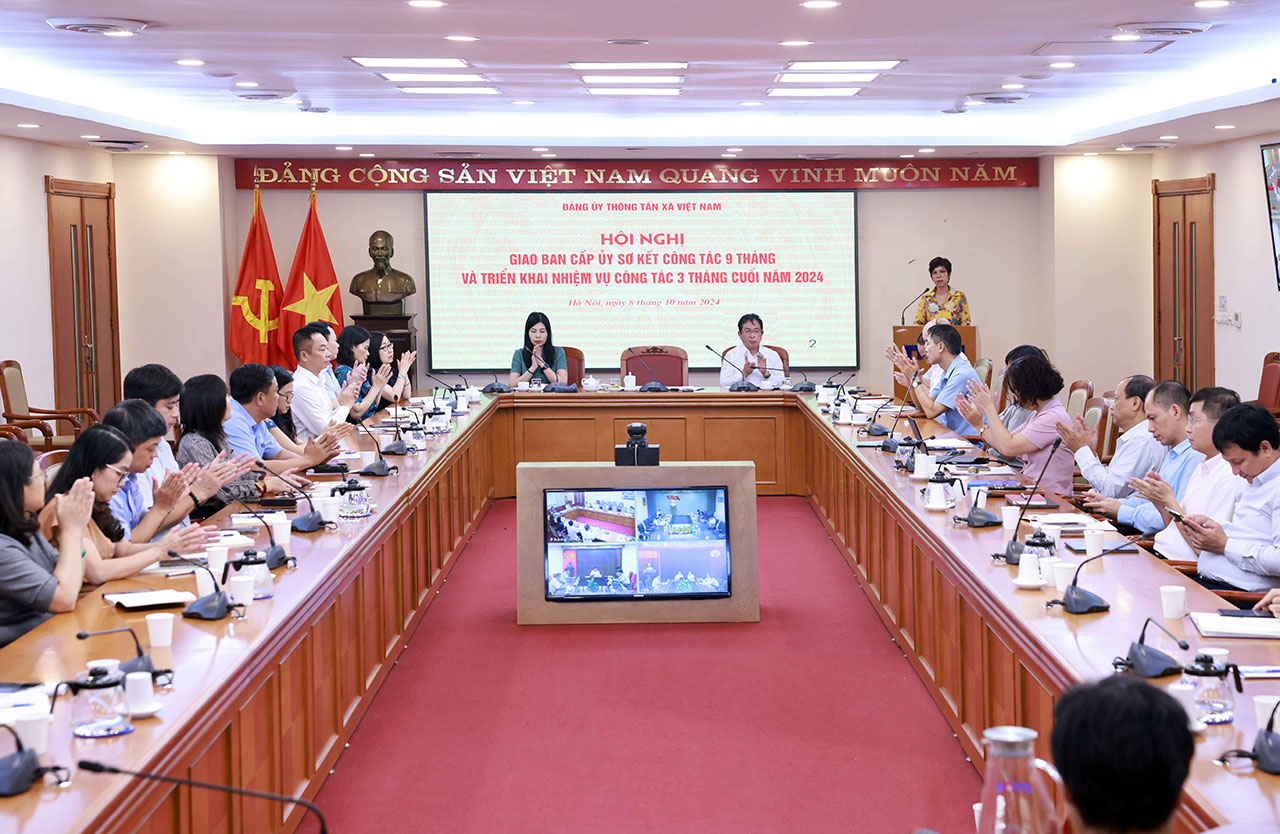 | Hội nghị giao ban cấp ủy sơ kết công tác 9 tháng và triển khai nhiệm vụ 3 tháng cuối năm 2024 của Đảng ủy TTXVN, ngày 8/10 |