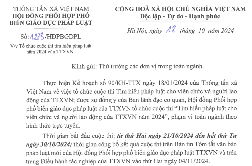 Thực hiện Kế hoạch công tác pháp chế của TTXVN năm 2024 (Kế hoạch số 90/KH-TTX), trong đó có nội dung “Tổ chức thi tìm hiểu pháp luật” theo hình thức trực tuyến;