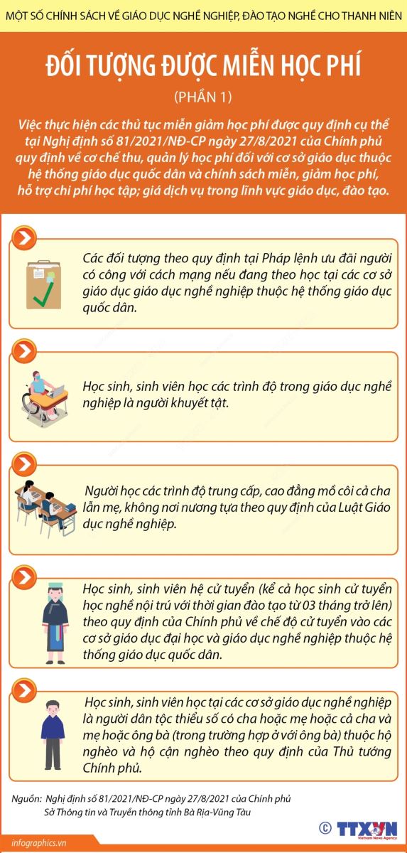 Phát triển giáo dục nghề nghiệp là một trong những nhiệm vụ quan trọng góp phần thực hiện đột phá chiến lược nâng cao chất lượng nguồn nhân lực, nhằm tăng năng suất lao động và năng lực cạnh tranh quốc gia. Việc thực hiện các thủ tục miễn, giảm học phí trong giáo dục nghề nghiệp, đào tạo nghề cho thanh niên được quy định cụ thể tại Nghị định số 81/2021/NĐ-CP ngày 27/8/2021 của Chính phủ quy định về cơ chế thu, quản lý học phí đối với cơ sở giáo dục thuộc hệ thống giáo dục quốc dân và chính sách miễn, giảm học phí, hỗ trợ chi phí học tập; giá dịch vụ trong lĩnh vực giáo dục, đào tạo.
