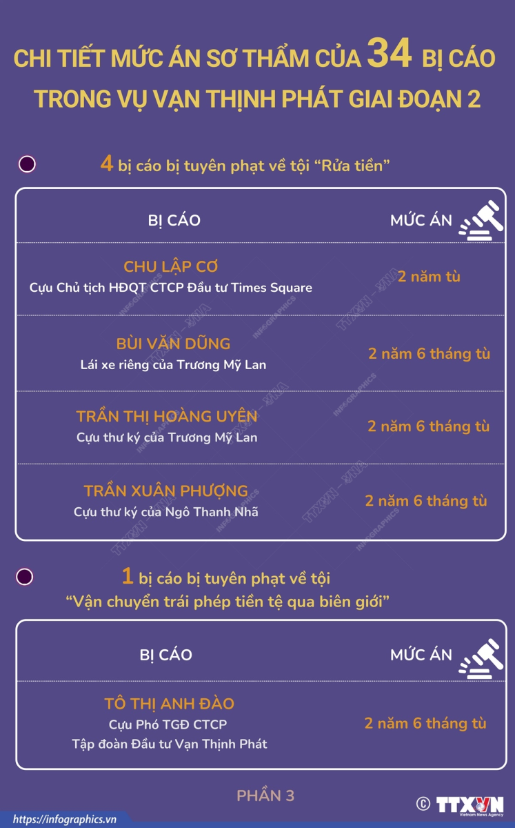 Phổ biến giáo dục Pháp luậtThông tin đồ họa Chi tiết mức án sơ thẩm của 34 bị cáo trong vụ Vạn Thịnh Phát giai đoạn 2 - Phần 3 Thứ ba, 29/10/2024 15:47 Hội đồng xét xử của phiên sơ thẩm giai đoạn 2 vụ án xảy ra tại CTCP Tập đoàn Vạn Thịnh Phát (Tập đoàn Vạn Thịnh Phát) và Ngân hàng Thương mại Cổ phần Sài Gòn (Ngân hàng SCB) đã tuyên án đối với các bị cáo. Theo đó, bị cáo Trương Mỹ Lan (cựu Chủ tịch HĐQT CTCP Tập đoàn Vạn Thịnh Phát) nhận mức án chung thân; 33 bị cáo còn lại nhận các mức án từ 2 năm đến 23 năm tù giam.
