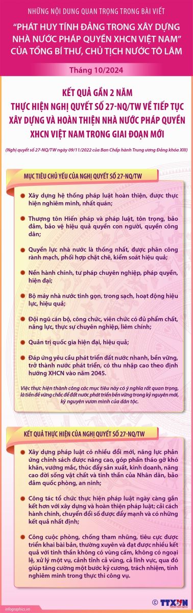 Phổ biến giáo dục Pháp luậtThông tin đồ họa Kết quả gần 2 năm thực hiện Nghị quyết số 27-NQ/TW về tiếp tục xây dựng và hoàn thiện Nhà nước pháp quyền XHCN Việt Nam trong giai đoạn mới Thứ ba, 29/10/2024 15:49 Trong bài viết “Phát huy tính Đảng trong xây dựng Nhà nước pháp quyền xã hội chủ nghĩa Việt Nam” viết tháng 10/2024, Tổng Bí thư, Chủ tịch nước Tô Lâm đã viết: Cùng với việc thực hiện công cuộc đổi mới, phát triển nền kinh tế thị trường định hướng XHCN , đất nước ta đã và đang từng bước xây dựng và hoàn thiện Nhà nước pháp quyền XHCN của Nhân dân, do Nhân dân, vì Nhân dân, dưới sự lãnh đạo của Đảng. Ngày 9/11/2022, Ban Chấp hành Trung ương Đảng khóa XIII ban hành Nghị quyết số 27-NQ/TW về tiếp tục xây dựng và hoàn thiện Nhà nước pháp quyền XHCN Việt Nam trong giai đoạn mới. Đây là lần đầu tiên Đảng ta ban hành một Nghị quyết chuyên đề về Nhà nước pháp quyền XHCN. Thực hiện Nghị quyết số 27-NQ/TW, trong gần 2 năm qua, chúng ta đã đạt được những kết quả đáng khích lệ. Trong đó, xây dựng pháp luật có nhiều đổi mới, năng lực phản ứng chính sách được nâng cao, góp phần tháo gỡ khó khăn, vướng mắc, thúc đẩy sản xuất, kinh doanh, nâng cao đời sống vật chất và tinh thần của Nhân dân, bảo đảm quốc phòng, an ninh...