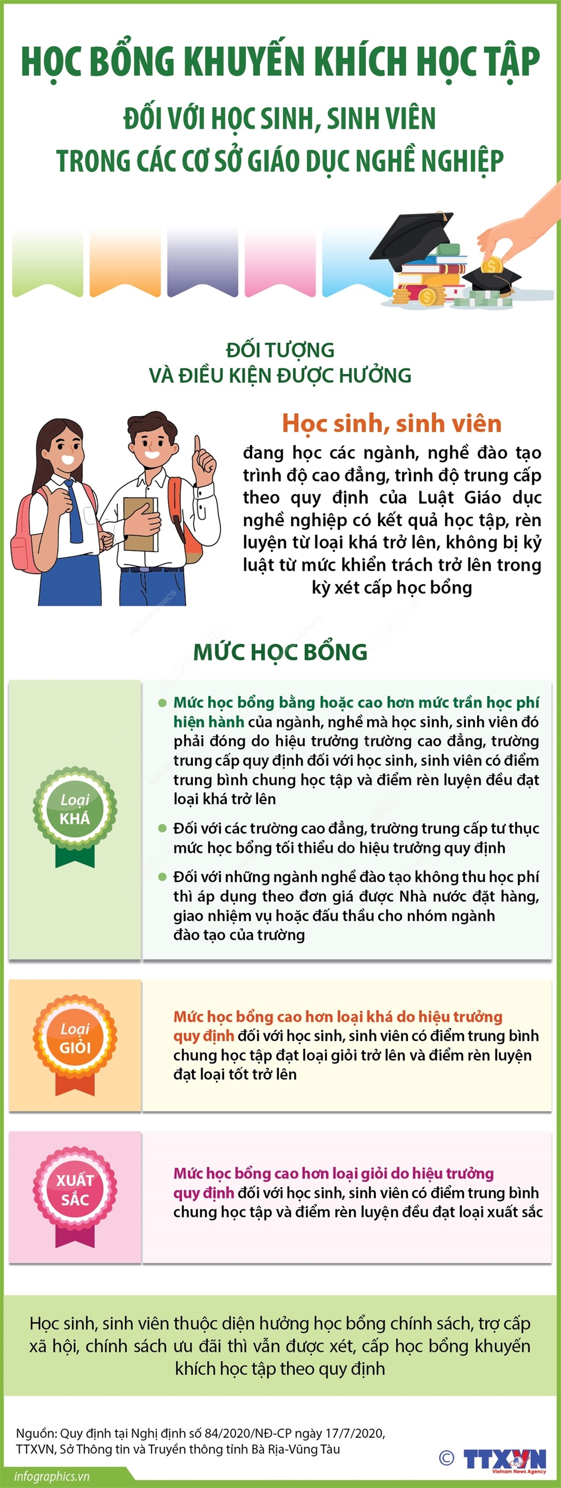 Phổ biến giáo dục Pháp luậtThông tin đồ họa Học bổng khuyến khích học tập đối với học sinh, sinh viên trong các cơ sở giáo dục nghề nghiệp Thứ ba, 29/10/2024 15:58 Chính sách học bổng khuyến khích học tập đối với học sinh, sinh viên là một trong những động lực để các học sinh, sinh viên phấn đấu đạt thành tích tốt trong học tập và rèn luyện. Nhằm khuyến khích học sinh, sinh viên trong các cơ sở giáo dục nghề nghiệp phấn đấu, rèn luyện đạt kết quả cao, Nghị định số 84/2020/NĐ-CP ngày 17/7/2020 của Chính phủ quy định chi tiết một số điều của Luật Giáo dục, quy định 2 loại học bổng đối với người học trình độ cao đẳng, trình độ trung cấp là: học bổng khuyến khích học tập và học bổng chính sách.