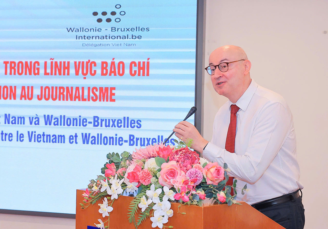 | Trưởng đại diện phái đoàn Wallonie-Bruxelles tại Việt Nam Pierre Du Ville phát biểu tại lễ tổng kết khóa học “Trí tuệ nhân tạo, tiềm năng và ứng dụng trong lĩnh vực báo chí”, ngày 1/11 |