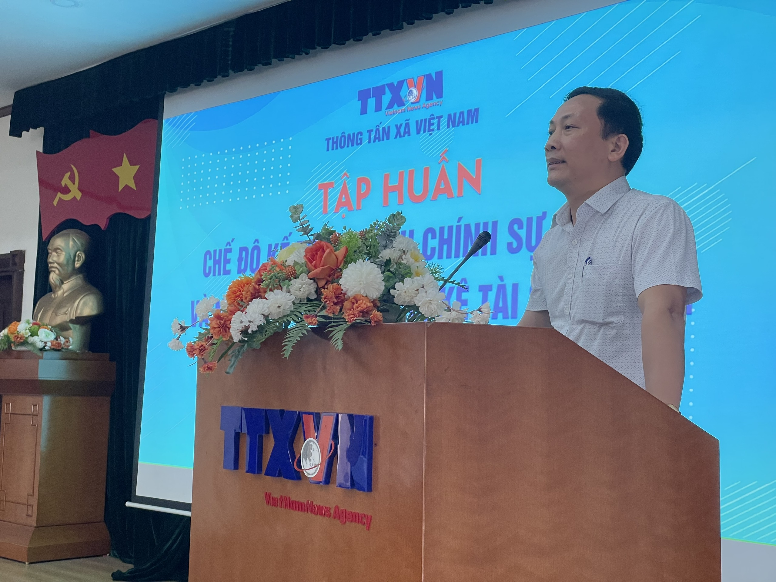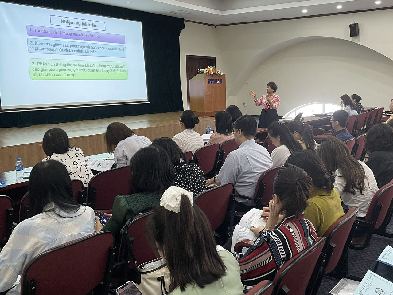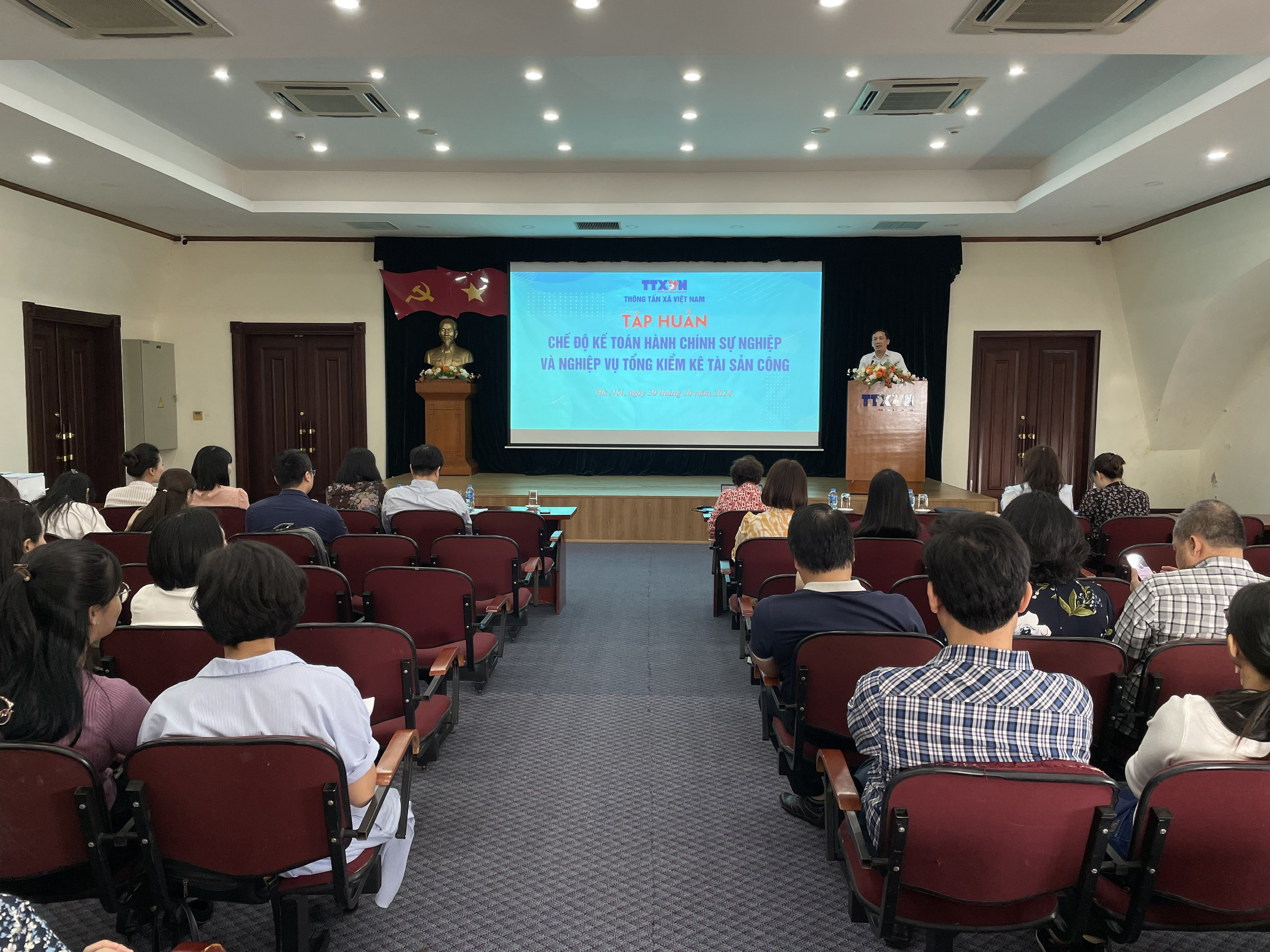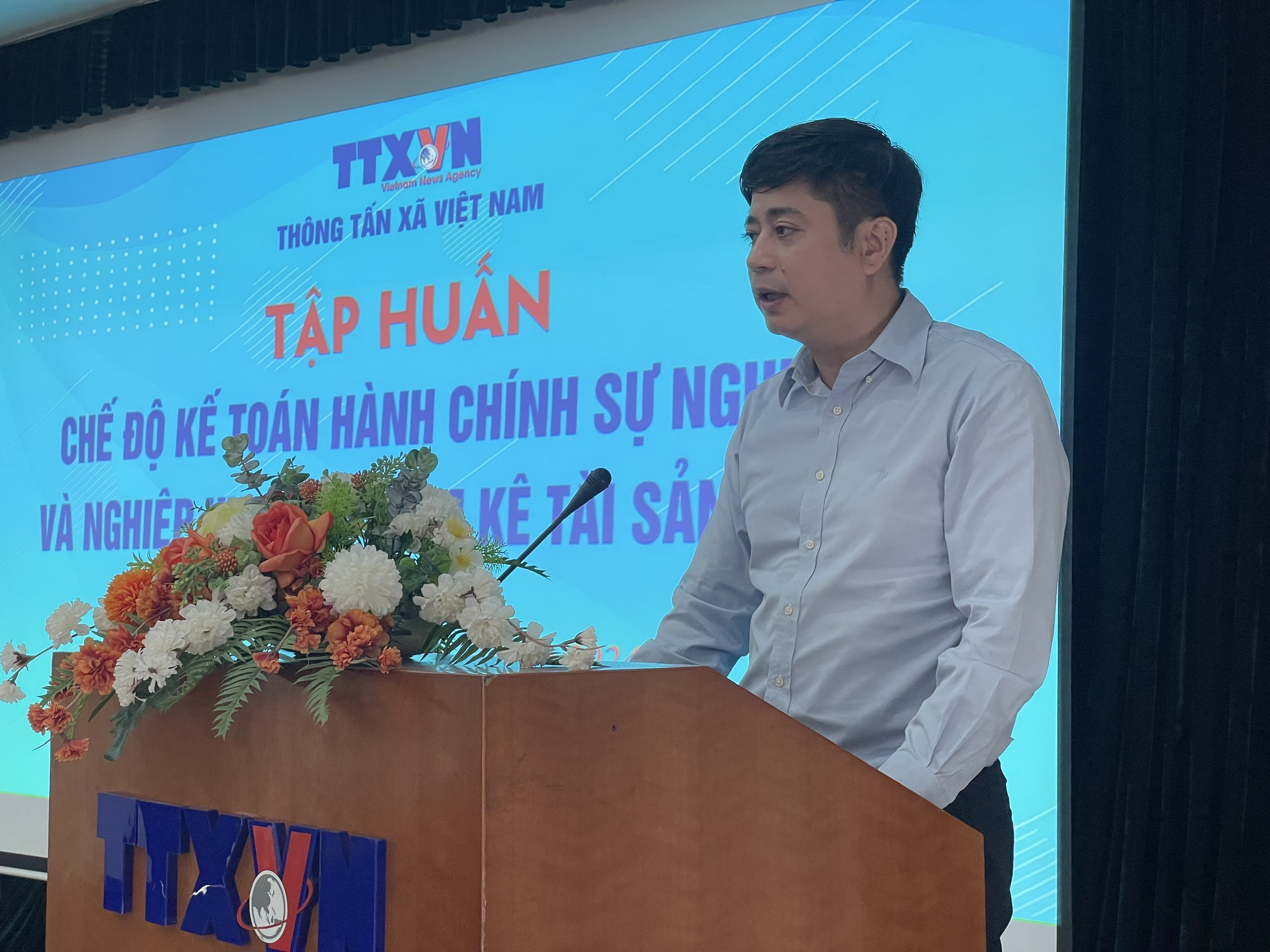 Sự kiện và kỷ niệmTin trong ngành Tập huấn về chế độ kế toán hành chính sự nghiệp và nghiệp vụ tổng kiểm kê tài sản công Thứ sáu, 01/11/2024 14:37 Từ ngày 30/10-1/11, Trung tâm Bồi dưỡng nghiệp vụ Thông tấn phối hợp với Ban Kế hoạch - Tài chính thuộc Thông tấn xã Việt Nam (TTXVN) tổ chức lớp tập huấn về chế độ kế toán hành chính sự nghiệp và nghiệp vụ tổng kiểm kê tài sản công cho gần 80 viên chức làm công tác tài chính, kế toán tại Ban Kế hoạch - Tài chính, các đơn vị dự toán sử dụng ngân sách nhà nước trực thuộc trong ngành và Ban chỉ đạo kiểm kê tài sản của TTXVN. Phó tổng giám đốc TTXVN Nguyễn Tuấn Hùng cùng Ban tổ chức và các học viên lớp tập huấn về chế độ kế toán hành chính sự nghiệp và nghiệp vụ tổng kiểm kê tài sản công, ngày 1/11 Tại lớp học, các học viên đã được giảng viên của Trường bồi dưỡng cán bộ Tài chính, Bộ Tài chính trao đổi những điểm mới của chế độ kế toán theo Thông tư 24/2024/TT-BTC; các yêu cầu quản lý tài chính tại đơn vị hành chính sự nghiệp; kế toán theo Thông tư 24/2024/TT-BTC và kỹ thuật điều chỉnh số liệu kế toán; hướng dẫn lập báo cáo quyết toán kinh phí hoạt động, báo cáo tài chính và quy trình quản lý, lưu trữ chứng từ kế toán; cung cấp nghiệp vụ thực hiện tổng kiểm kê tài sản công theo Quyết định số 213/QĐ-TTg của Thủ tướng chính phủ. Thạc sĩ Trần Thị Thu Hương, Cục Giám sát, quản lý kế toán kiểm toán, Bộ Tài chính trao đổi nghiệp vụ kế toán hành chính sự nghiệp theo Thông tư 24/2024/TT-BTC, ngày 30/10 Khóa học góp phần nâng cao trình độ chuyên môn cho đội ngũ làm công tác tài chính - kế toán, bảo đảm thực hiện đúng các nguyên tắc, chuẩn mực của kế toán Việt Nam./. Một số hình ảnh tại lớp học: Nội san Thông tấn