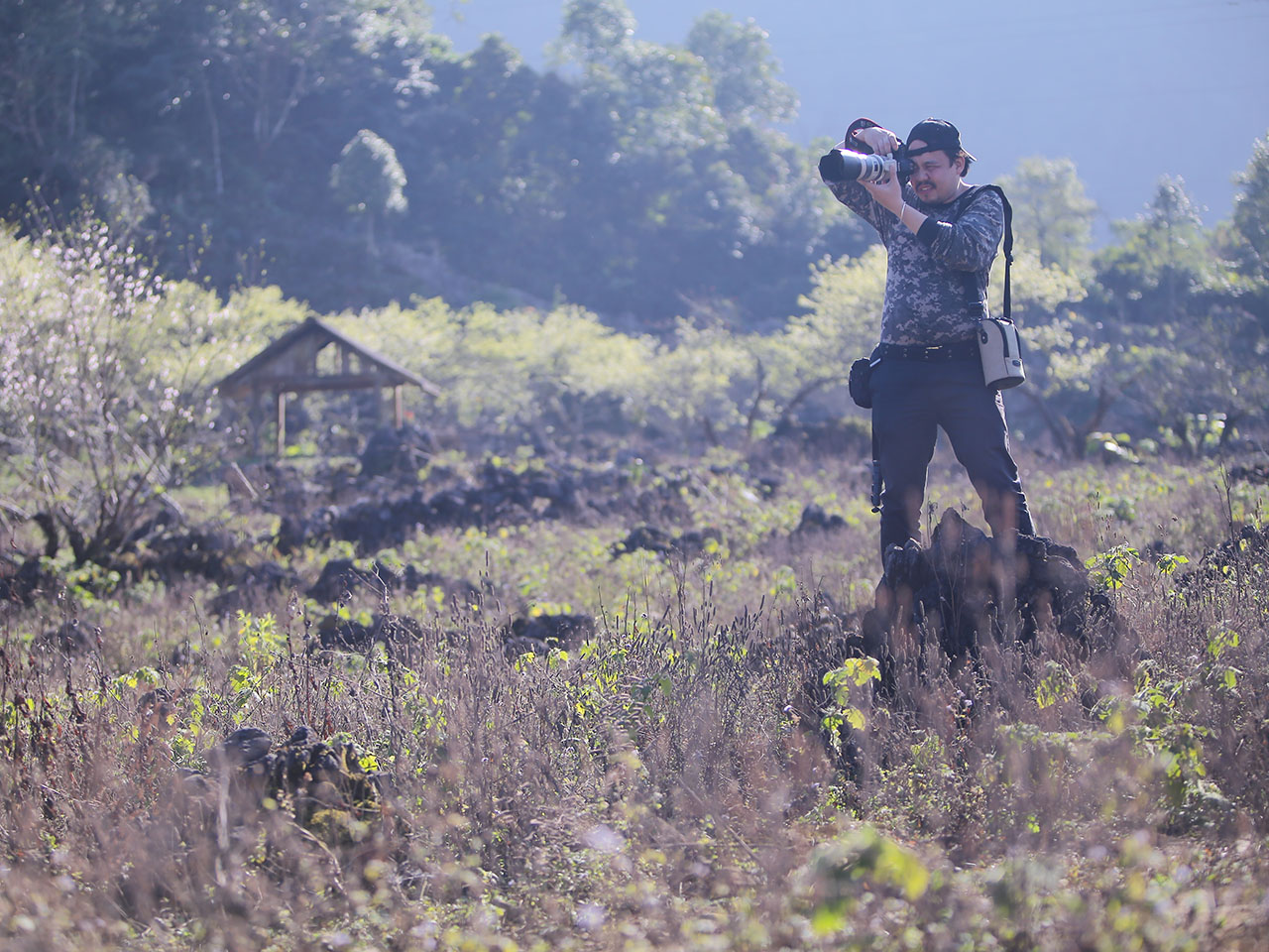 | Phóng viên Báo ảnh Việt Nam Trần Thanh Giang trong một chuyến tác nghiệp tại Tây Bắc |
