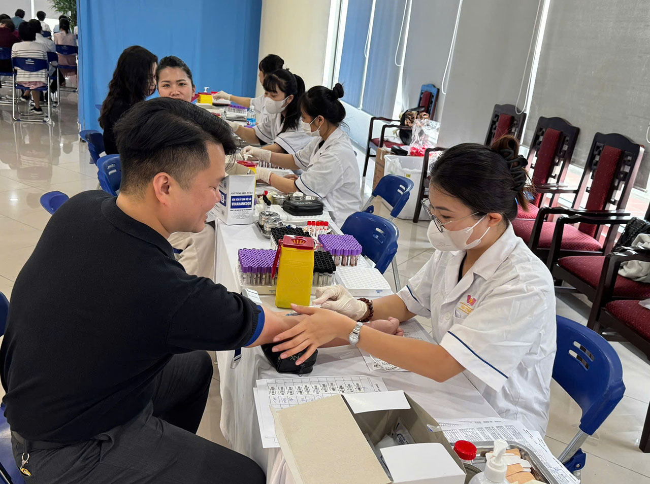 Sự kiện và kỷ niệmTin trong ngành Khám sức khỏe định kỳ cho viên chức, người lao động TTXVN Thứ hai, 11/11/2024 15:02 Từ ngày 5-8/11, tại Trung tâm Thông tấn quốc gia, số 5 Lý Thường Kiệt, Hà Nội, hơn 1.000 viên chức và người lao động làm việc ở khu vực phía Bắc đã tham gia chương trình kiểm tra sức khỏe định kỳ hằng năm do Thông tấn xã Việt Nam (TTXVN) tổ chức, nhằm phát hiện bệnh sớm, điều trị bệnh kịp thời và lưu trữ hồ sơ dữ liệu sức khỏe cá nhân. Lấy mẫu máu xét nghiệm tổng quát, một bước trong quy trình kiểm tra sức khỏe định kỳ tại TTXVN, ngày 7/11 Tham gia khám sức khỏe, cán bộ, phóng viên, nhân viên được cân, đo huyết áp; xét nghiệm máu; siêu âm ổ bụng tổng quát và siêu âm tuyến giáp. Lịch khám sức khỏe được chia cụ thể theo từng khung giờ để đảm bảo lịch làm việc của từng đơn vị. Sau khi có kết quả, Phòng Y tế cơ quan tổ chức tư vấn cách bảo vệ, chăm sóc sức khỏe; chẩn đoán và hướng điều trị các trường hợp bị bệnh cho công chức, viên chức, người lao động./. Nội san Thông tấn