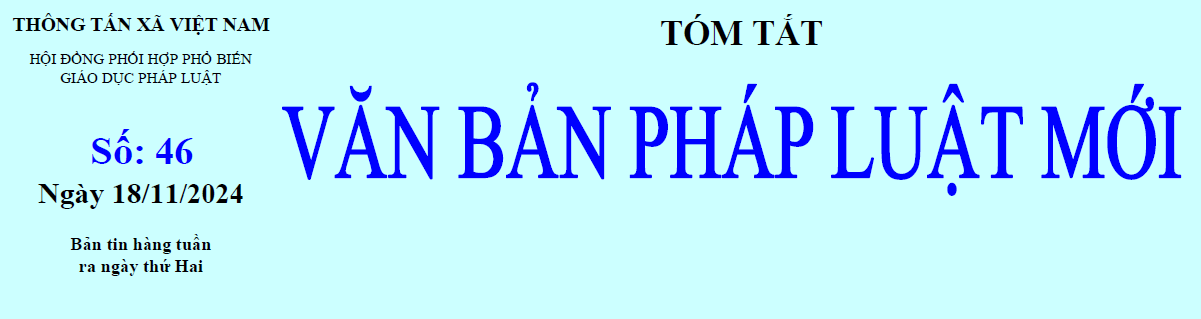 Phổ biến giáo dục Pháp luậtBản tin văn bản Pháp luật Tóm tắt Văn bản pháp luật mới: số 46 ngày 18/11/2024 của Hội đồng phối hợp Phổ biến giáo dục pháp luật TTXVN Thứ ba, 03/12/2024 15:26 Phòng Tổng hợp - Kiểm tra - Pháp chếThường trực Hội đồng phối hợp Phổ biến giáo dục pháp luật TTXVN