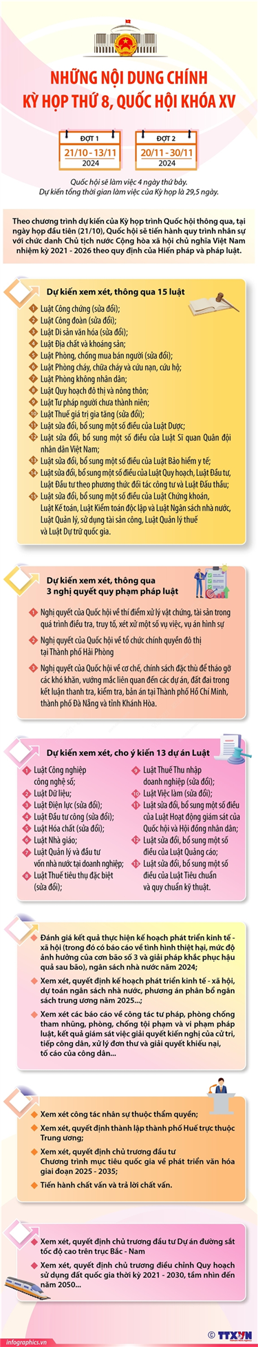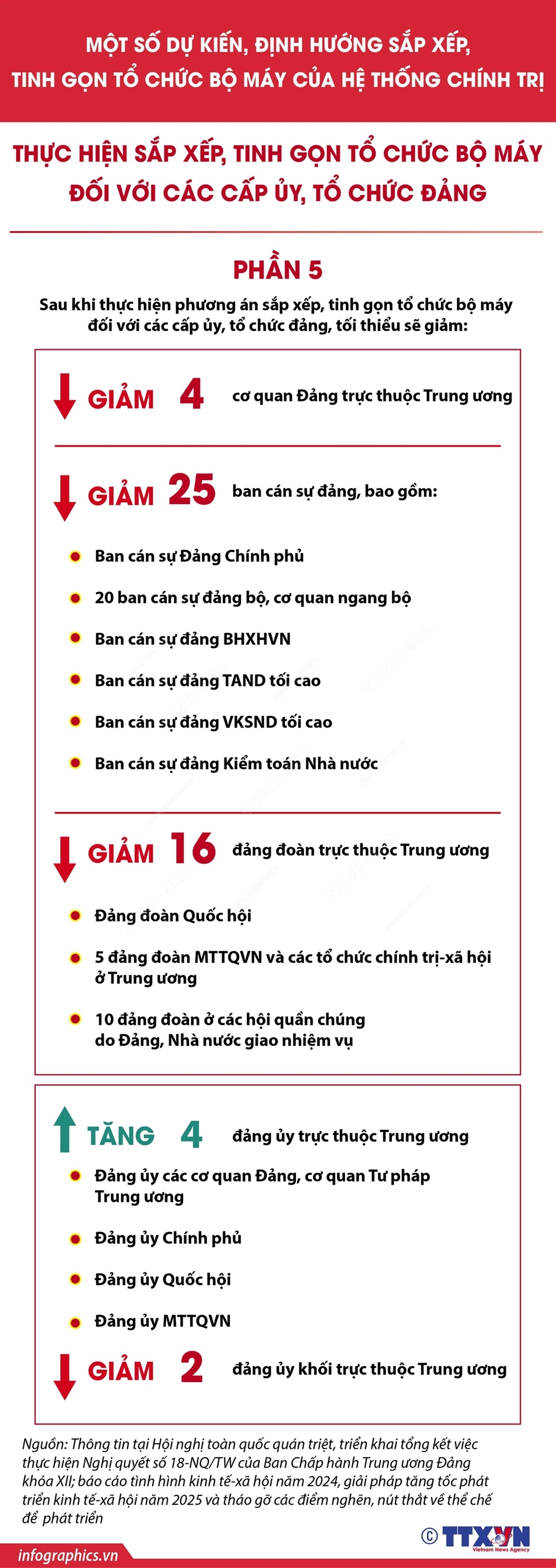 Phổ biến giáo dục Pháp luậtThông tin đồ họa Dự kiến sắp xếp, tinh gọn tổ chức bộ máy đối với các cấp ủy, tổ chức đảng (phần 5) Thứ ba, 03/12/2024 15:31 Tại Hội nghị toàn quốc quán triệt, triển khai tổng kết việc thực hiện Nghị quyết số 18-NQ/TW của Ban Chấp hành Trung ương Đảng khóa XII và một số nội dung quan trọng ngày 1/12/2024, Ủy viên Bộ Chính trị, Bí thư Trung ương Đảng, Trưởng Ban Tổ chức Trung ương Lê Minh Hưng đã truyền đạt các nội dung chính, trọng tâm trong triển khai tổng kết Nghị quyết số 18-NQ/TW của Ban Chấp hành Trung ương Đảng khóa XII. Theo đó, sau khi thực hiện phương án sắp xếp, tinh gọn tổ chức bộ máy đối với các cấp ủy, tổ chức đảng, tối thiểu sẽ giảm: 4 cơ quan Đảng trực thuộc Trung ương, 25 Ban Cán sự Đảng, 16 Đảng đoàn trực thuộc Trung ương; tăng 2 Đảng ủy trực thuộc Trung ương.