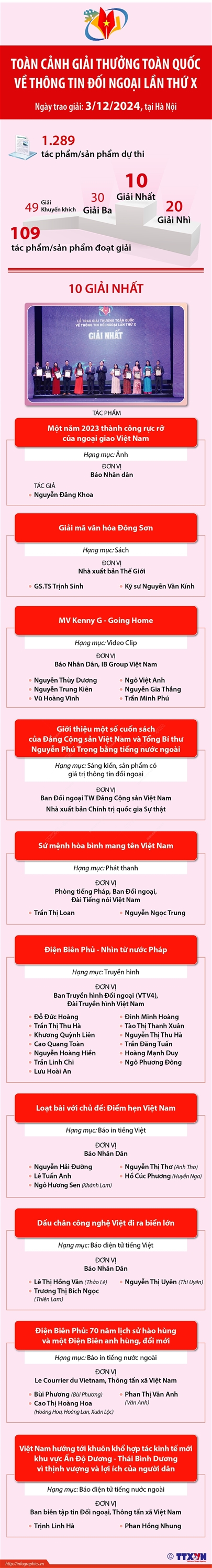 Qua hai vòng chấm Sơ khảo và Chung khảo, Hội đồng Giải thưởng Toàn quốc về Thông tin Đối ngoại lần thứ X đã quyết định trao giải cho 109 tác phẩm, sản phẩm xuất sắc gồm: 10 Giải Nhất, 20 Giải Nhì, 30 Giải Ba và 49 Giải Khuyến khích./.