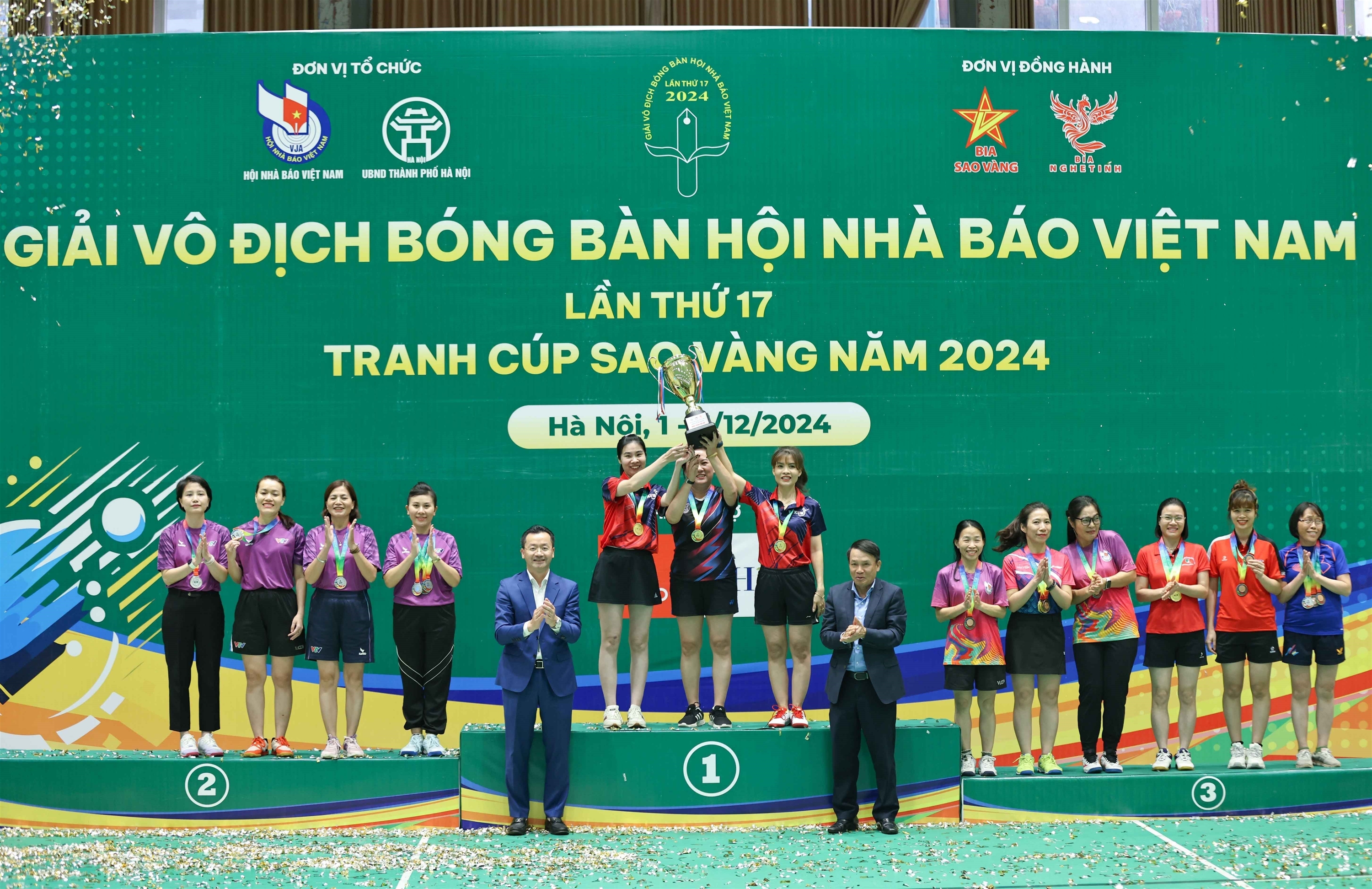 | Các vận động viên của Liên quân Liên chi hội Nhà báo TTXVN và Hội Nhà báo TP. Hà Nội nhận giải Nhất đồng đội nữ Giải vô địch bóng bàn Hội Nhà báo Việt Nam lần thứ 17 - tranh Cúp Sao Vàng năm 2024, ngày 3/12 |
