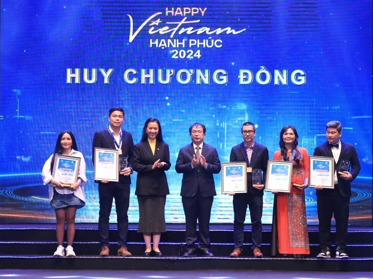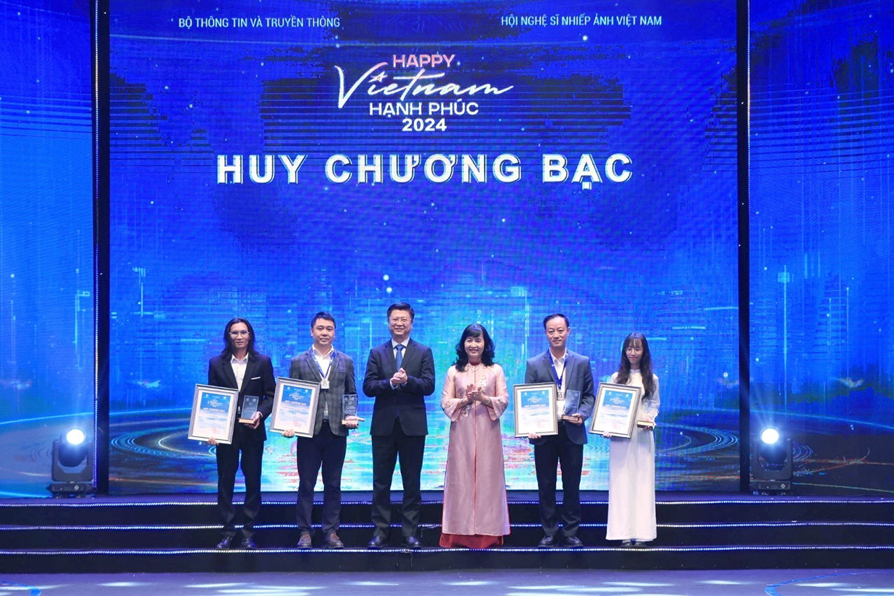 | Tác giả Dương Văn Giang (thứ hai bên trái) và tác giả Trần Huy Hùng (thứ hai bên phải) nhận huy chương Bạc Cuộc thi ảnh, video “Việt Nam hạnh phúc - Happy Vietnam” năm 2024, tối 11/12 |