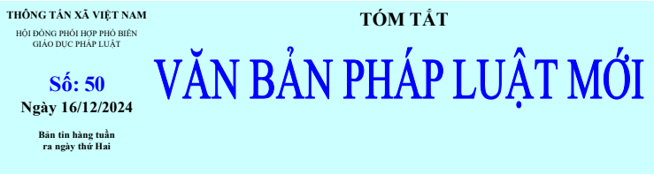 Phổ biến giáo dục Pháp luậtBản tin văn bản Pháp luật Tóm tắt Văn bản pháp luật mới: số 50 ngày 16/12/2024 của Hội đồng phối hợp Phổ biến giáo dục pháp luật TTXVN Thứ tư, 18/12/2024 15:02 Phòng Tổng hợp - Kiểm tra - Pháp chếThường trực Hội đồng phối hợp Phổ biến giáo dục pháp luật TTXVN