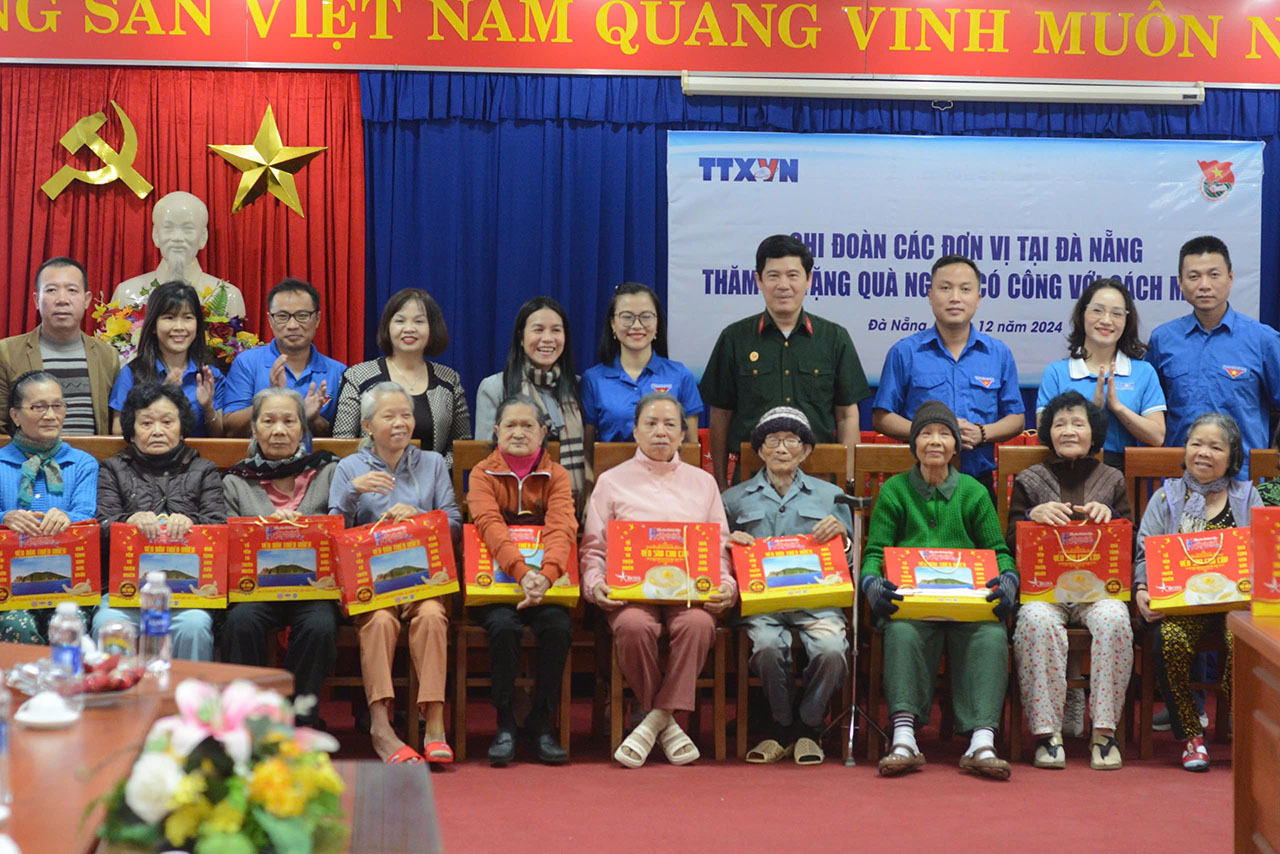 Sự kiện và kỷ niệmTin trong ngành Thăm và tặng quà Trung tâm phụng dưỡng người có công với cách mạng Đà Nẵng Thứ sáu, 20/12/2024 08:47 Nhân dịp kỷ niệm 80 năm Ngày thành lập Quân đội nhân dân Việt Nam và 35 năm Ngày hội Quốc phòng toàn dân, ngày 20/12, Đoàn thanh niên và Chi hội cựu chiến binh Cơ quan Thông tấn xã Việt Nam (TTXVN) khu vực miền Trung-Tây Nguyên đã đến thăm và trao tặng 46 suất quà tại Trung tâm phụng dưỡng người có công với cách mạng TP. Đà Nẵng (quận Ngũ Hành Sơn, TP. Đà Nẵng). Đại diện Đoàn thanh niên và Chi hội cựu chiến binh Cơ quan TTXVN khu vực miền Trung-Tây Nguyên tặng quà tại Trung tâm Phụng dưỡng người có công cách mạng TP. Đà Nẵng, ngày 20/12 Hoạt động nhằm phát huy truyền thống “Uống nước nhớ nguồn”, giáo dục lịch sử, khơi dậy tinh thần cống hiến của thế hệ trẻ./. Đại diện Đoàn thanh niên Cơ quan TTXVN khu vực miền Trung-Tây Nguyên tặng quà người có công với cách mạng tại Trung tâm Phụng dưỡng người có công cách mạng TP. Đà Nẵng, ngày 20/12 TTXVN/Nội san Thông tấn
