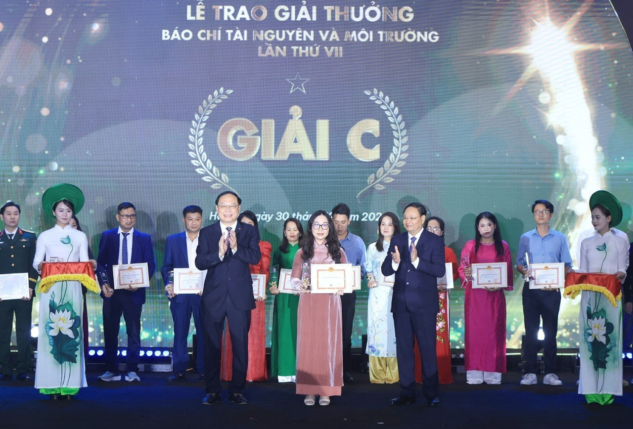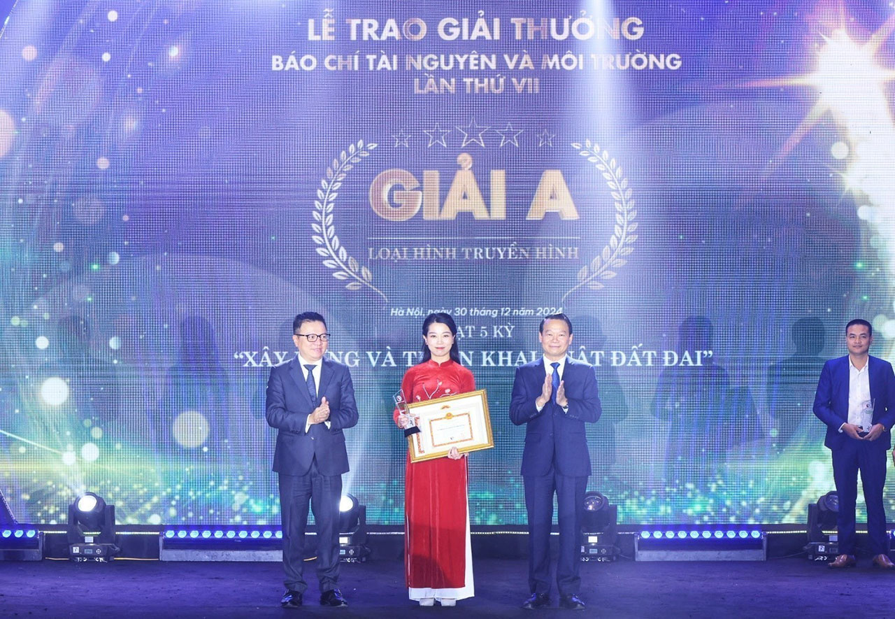 | Chủ tịch Hội nhà báo Việt Nam Lê Quốc Minh và Bộ trưởng Bộ Tài nguyên và Môi trường Đỗ Đức Duy trao giải A cho phóng viên Phạm Thị Hồng Thanh, đại diện nhóm tác giả Trung tâm truyền hìnhThông tấn, tại lễ trao Giải thưởng báo chí Tài nguyên và Môi trường lần thứ VII, tối 30/12 |