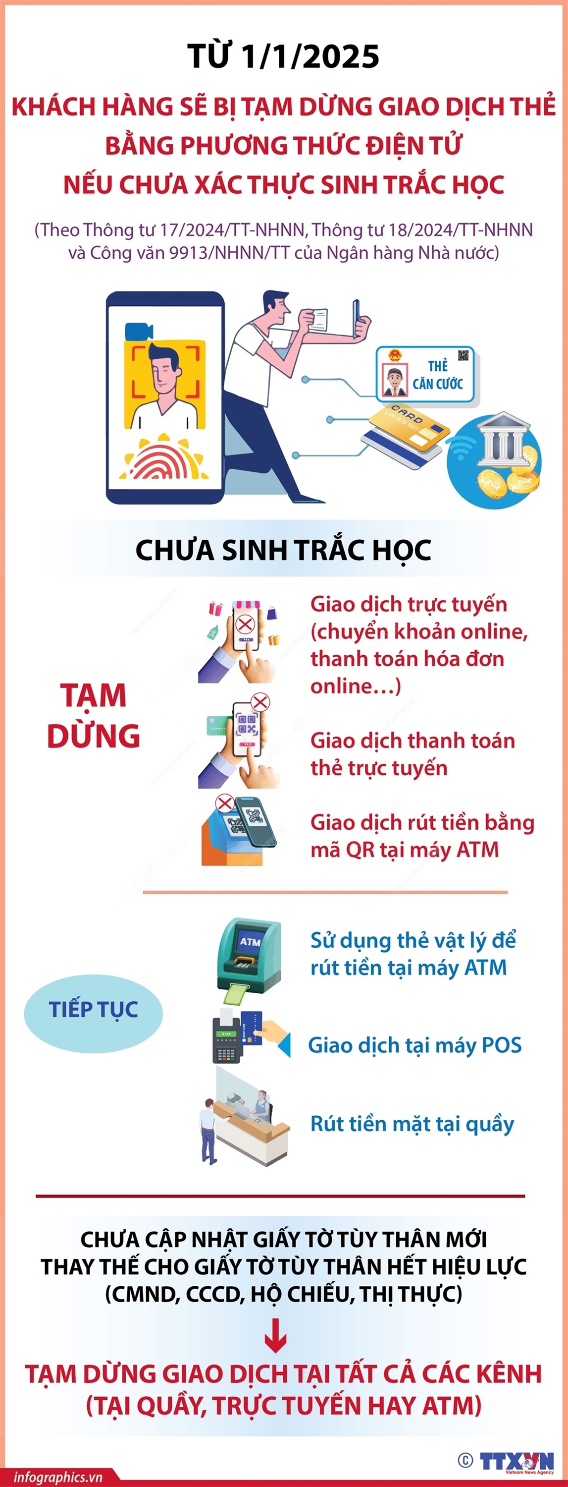 Theo Thông tư 17/2024/TT-NHNN; Thông tư 18/2024/TT-NHNN và Công văn 9913/NHNN/TT của Ngân hàng Nhà nước, từ 1/1/2025, nếu không xác thực sinh trắc học, khách hàng sẽ bị TẠM DỪNG giao dịch trực tuyến bằng thẻ, giao dịch thanh toán thẻ trực tuyến và giao dịch rút tiền bằng mã QR tại máy ATM. Tuy nhiên, khách hàng vẫn có thể sử dụng thẻ vật lý để rút tiền tại máy ATM, giao dịch tại máy POS và rút tiền tại các quầy giao dịch của ngân hàng.