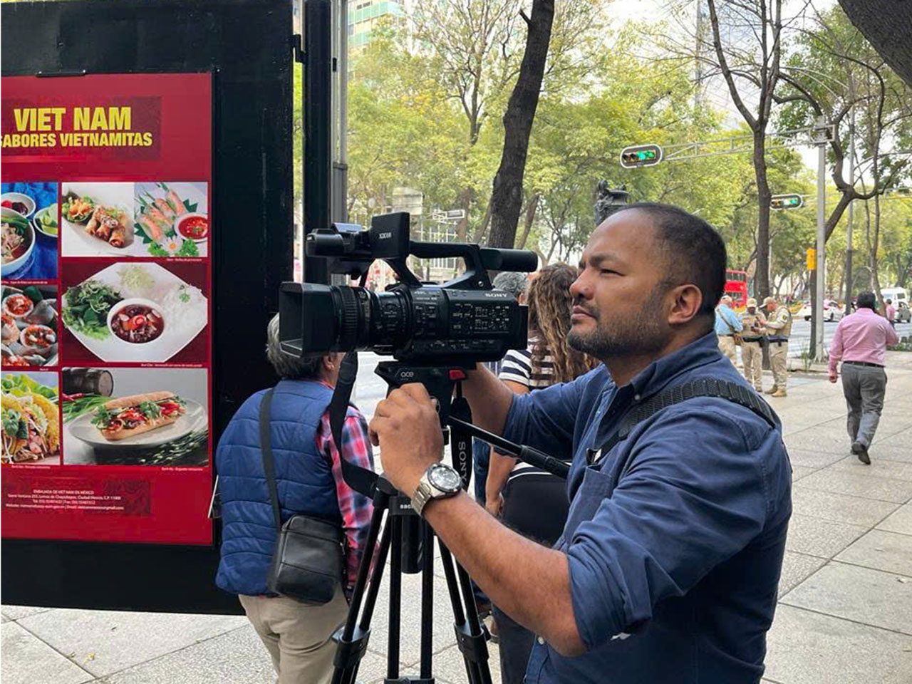 | Trưởng CQTT TTXVN tại Mexico City Trương Phi Hùng tác nghiệp tại triển lãm ảnh về đất nước con người Việt Nam tại Mexico, tháng 4/2024 |
