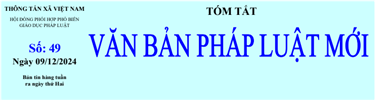 Tin cùng chuyên mục Tóm tắt Văn bản pháp luật mới: số 52 ngày 30/12/2024 của Hội đồng phối hợp Phổ biến giáo dục pháp luật TTXVN31/12/2024 14:55 Tóm tắt Văn bản pháp luật mới: số 51 ngày 23/12/2024 của Hội đồng phối hợp Phổ biến giáo dục pháp luật TTXVN31/12/2024 14:53 Tóm tắt Văn bản pháp luật mới: số 50 ngày 16/12/2024 của Hội đồng phối hợp Phổ biến giáo dục pháp luật TTXVN18/12/2024 15:02 Tóm tắt Văn bản pháp luật mới: số 49 ngày 09/12/2024 của Hội đồng phối hợp Phổ biến giáo dục pháp luật TTXVN10/12/2024 15:16 Tóm tắt Văn bản pháp luật mới: số 48 ngày 02/12/2024 của Hội đồng phối hợp Phổ biến giáo dục pháp luật TTXVN03/12/2024 15:29 Tóm tắt Văn bản pháp luật mới: số 47 ngày 25/11/2024 của Hội đồng phối hợp Phổ biến giáo dục pháp luật TTXVN03/12/2024 15:27