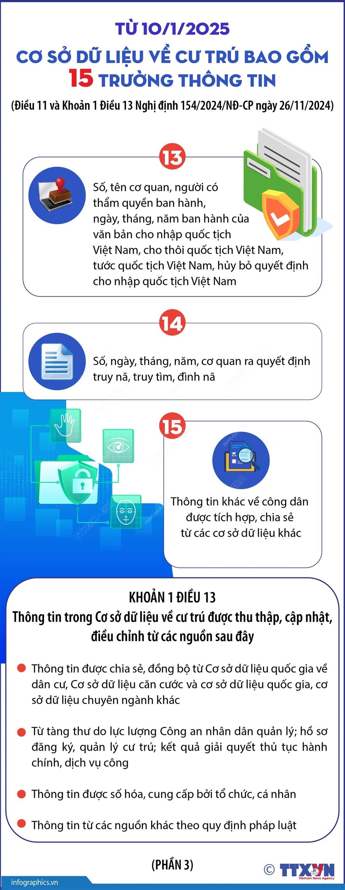 Phổ biến giáo dục Pháp luậtThông tin đồ họa Từ 10/1/2025: Cơ sở dữ liệu về cư trú bao gồm 15 trường thông tin (phần 3 và hết) Thứ tư, 15/01/2025 15:10 Theo quy định mới nhất tại Điều 11 và Khoản 1 Điều 13 Nghị định 154/2024/NĐ-CP ngày 26/11/2024 quy định chi tiết một số điều và biện pháp thi hành Luật Cư trú, từ 10/1/2025, Cơ sở dữ liệu về cư trú của công dân gồm 15 trường thông tin: Số hồ sơ cư trú; Thông tin quy định tại khoản 1 đến khoản 15, khoản 21 đến khoản 25 Điều 9 và khoản 4 Điều 15 Luật Căn cước; Tên gọi khác; Nơi thường trú, thời gian bắt đầu đến thường trú, lý do, thời điểm xóa đăng ký thường trú; Nơi tạm trú, thời gian bắt đầu đến tạm trú, thời gian tạm trú, lý do, thời điểm xóa đăng ký tạm trú… Thông tin trong Cơ sở dữ liệu về cư trú được thu thập, cập nhật, điều chỉnh từ các nguồn sau đây: Thông tin được chia sẻ, đồng bộ từ Cơ sở dữ liệu quốc gia về dân cư, Cơ sở dữ liệu căn cước và cơ sở dữ liệu quốc gia, cơ sở dữ liệu chuyên ngành khác; Từ tàng thư do lực lượng Công an nhân dân quản lý; hồ sơ đăng ký, quản lý cư trú; kết quả giải quyết thủ tục hành chính, dịch vụ công; Thông tin được số hóa, cung cấp bởi tổ chức, cá nhân và Thông tin từ các nguồn khác theo quy định pháp luật.